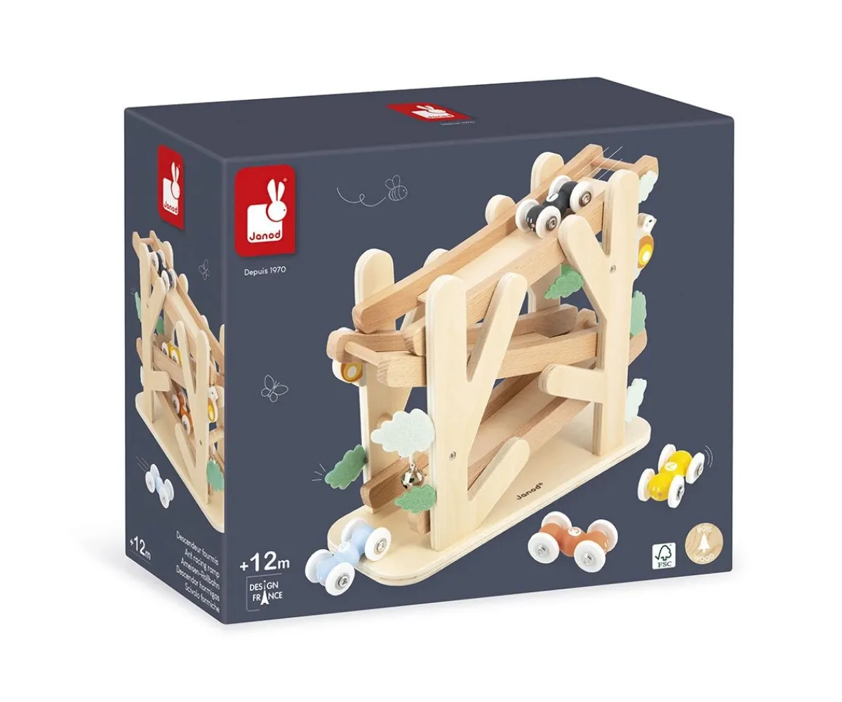 El original circuito de madera de Janod por el que podrás lanzar a los vehículos de colores con forma de hormiguita. A los peques les encantará colocar a las hormigas una a una en la cima del circuito y verlas dencender a toda prisa.