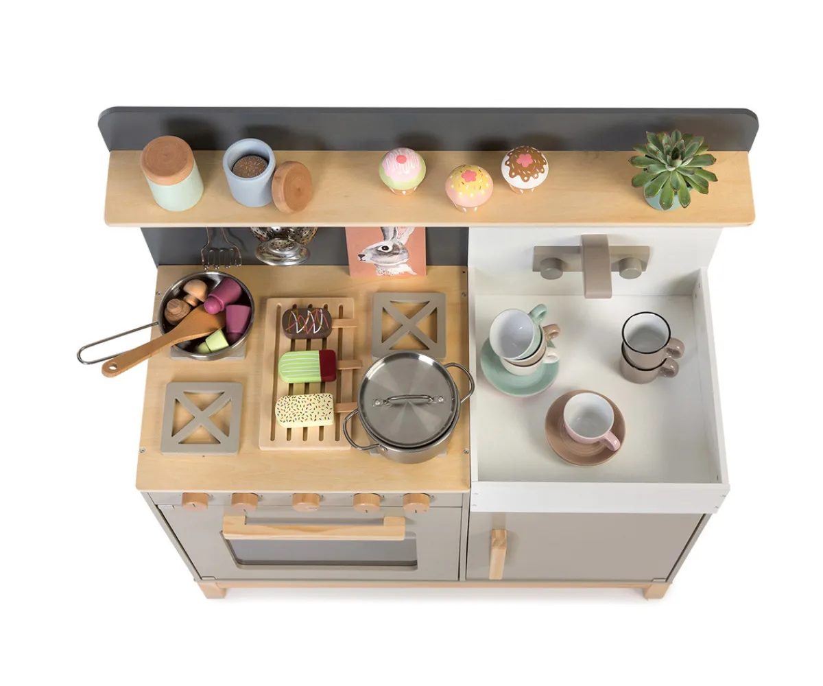 LINUM es una cocina de madera que combina estilo y funcionalidad en un diseño moderno y atractivo, con tonos naturales de madera y detalles en gris cálido. Ideal para desarrollar la motricidad fina y la creatividad, esta cocina infantil ofrece horas de juego imaginativo, fomentando que los pequeños chefs aprendan y se diviertan al mismo tiempo. La pared trasera incluye una pizarra gris, perfecta para dibujar, escribir menús o planificar recetas.