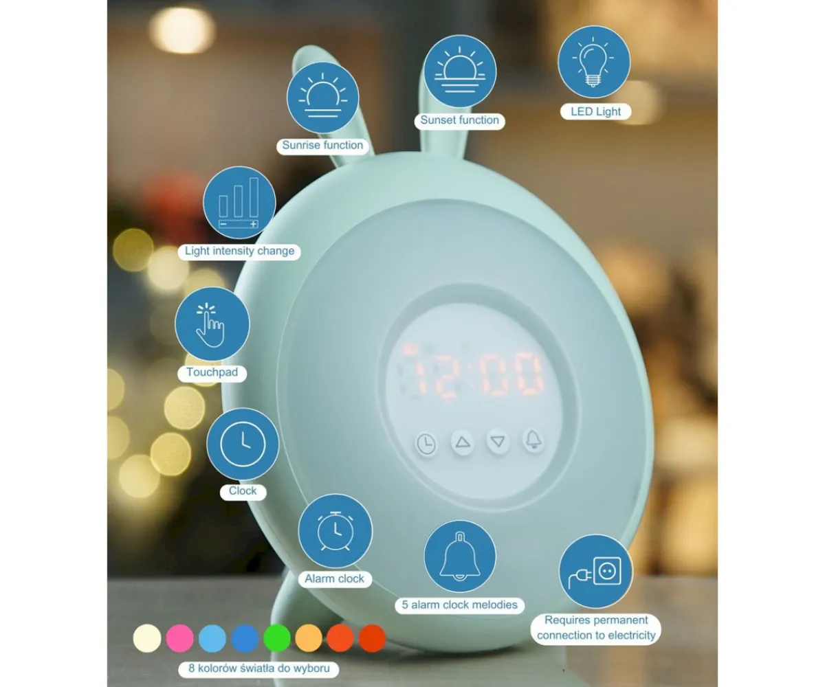 El reloj despertador con forma de conejito de Rabbit&Friends acompañará a los peques cada mañana en su despertar. Muestra la hora, es despertador y lámapara, cuya intensidad y color de luz puede cambiar.