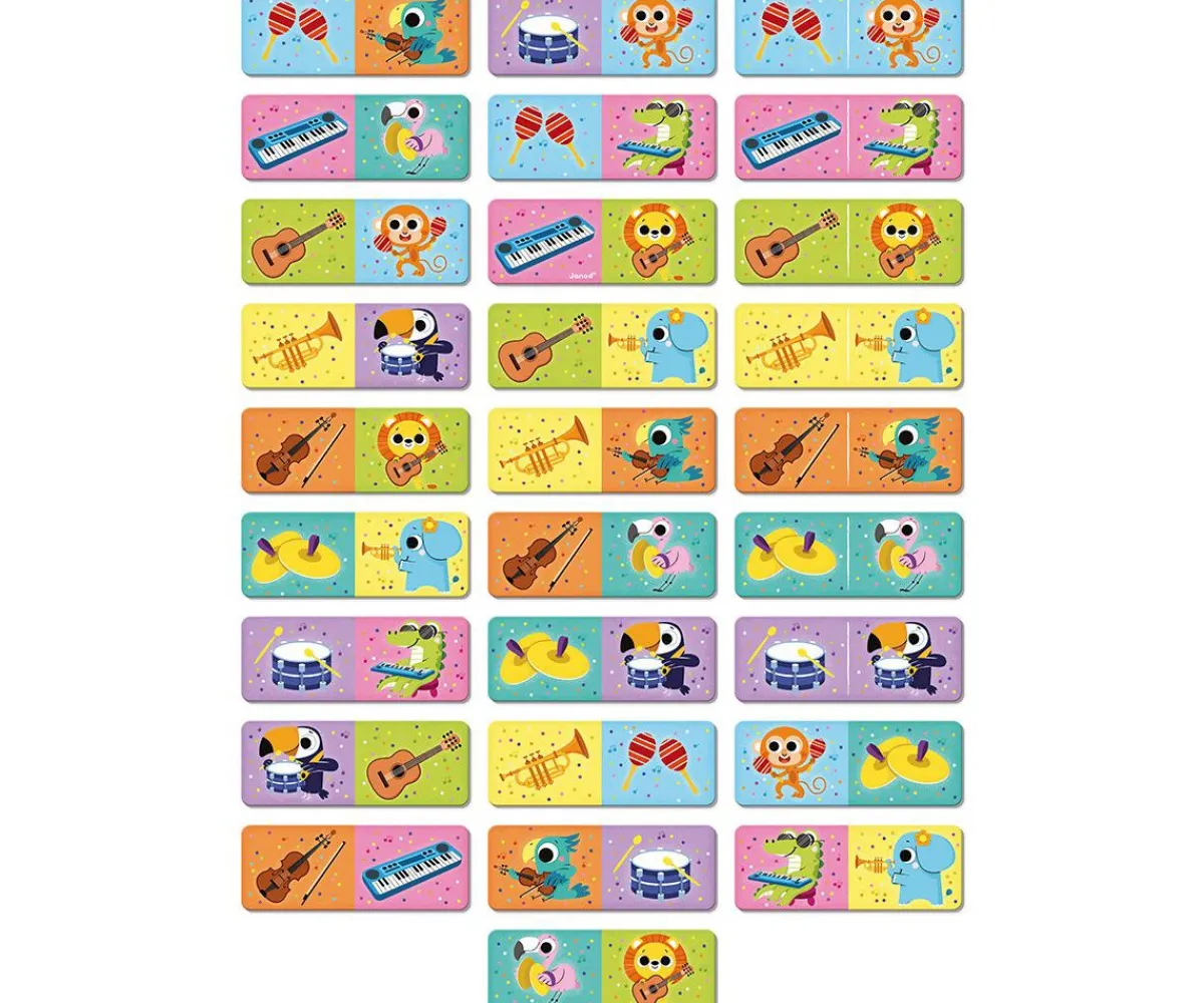 ¡Este dominó de Janod es súper divertido para que los peques aprendan sobre instrumentos y animales de la jungla! Las ilustraciones coloridas y reversibles animarán a los peques a unirlas y jugar imitando los sonidos y los animales.