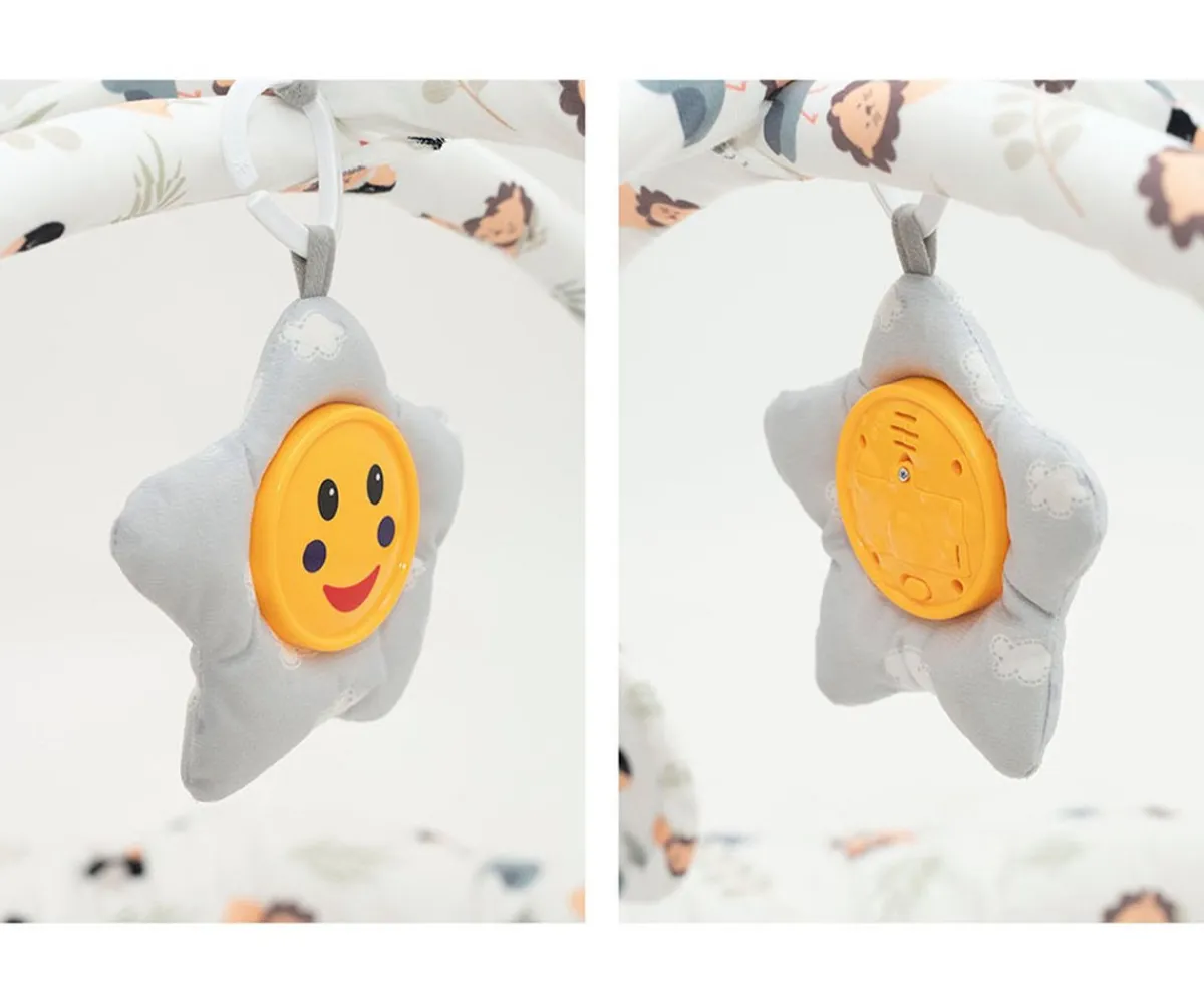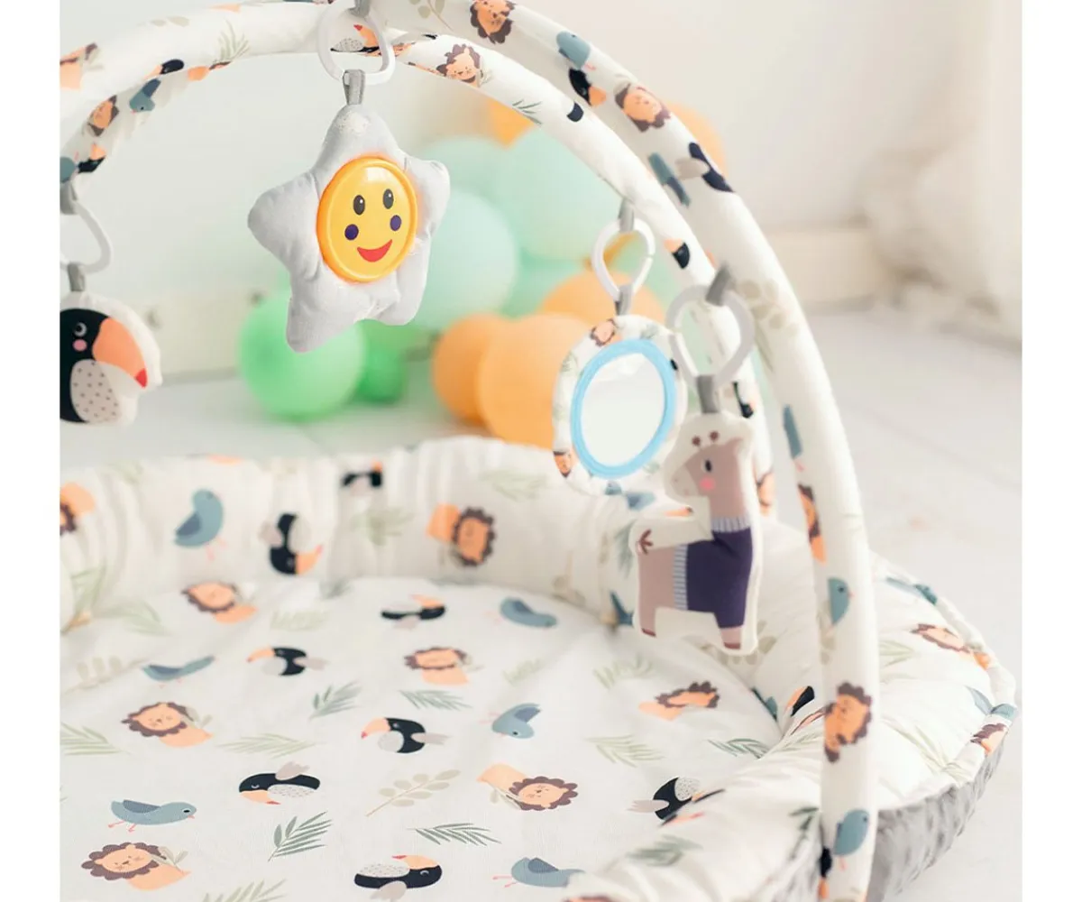 La alfombra de actividades Lion de Olmitos, es reversible, con arcos y ha sido diseñada para acompañar a tu pequeño desde sus primeros días. Además de estimular el desarrollo motor, visual y cognitivo; también proporciona un espacio acogedor y seguro gracias a sus laterales acolchados. Con los arcos y juguetes colgantes, tu bebé podrá disfrutar de una zona de juegos que le permita descubrir nuevas habilidades.