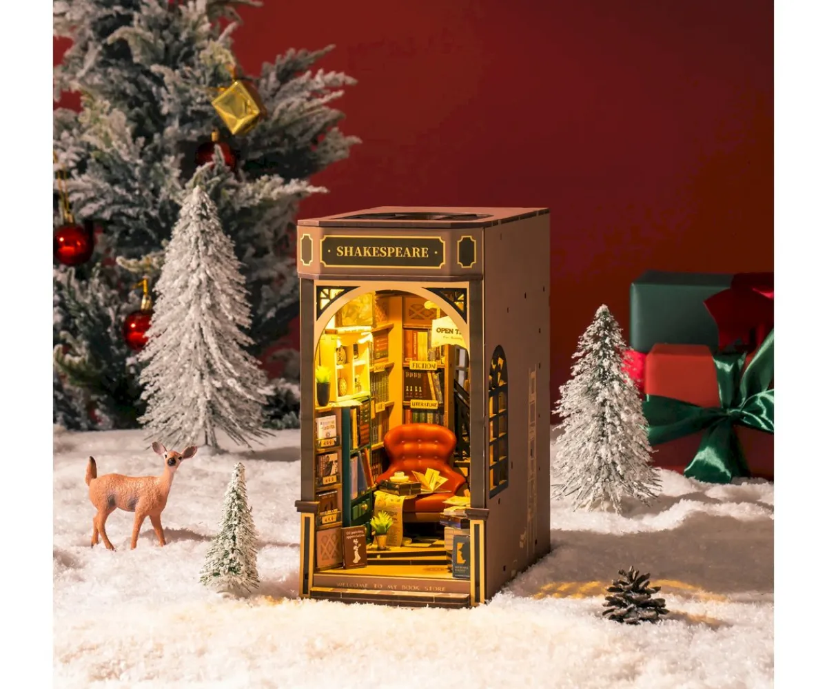 Inspirada en la famosa Shakespeare´s Bookstore de Francia Rolife ha diseñado este kit para crear con tus propias manos un soporte de madera con detalles en miniatura. Se trata de una librería adecuada para la lectura ya que incluye un área de lectura con sofás de cuero rojo y escritorios.