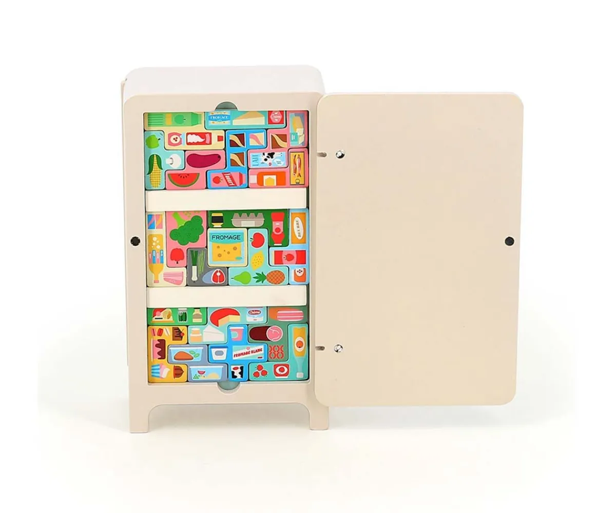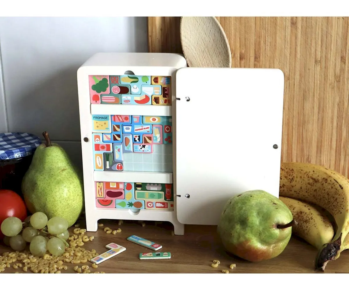 ¡Después de hacer la compra, toca ordenar! Con el frigorífico de madera de Vilac y el juego de lógica Pack it Right, ilustrado por Ingela P. Arrhenius, los peques se divertirán organizando alimentos magnéticos. Incluye barras ajustables y un cuadernillo con soluciones para seguir aprendiendo. Un juego original que estimula la lógica, la motricidad y la creatividad.