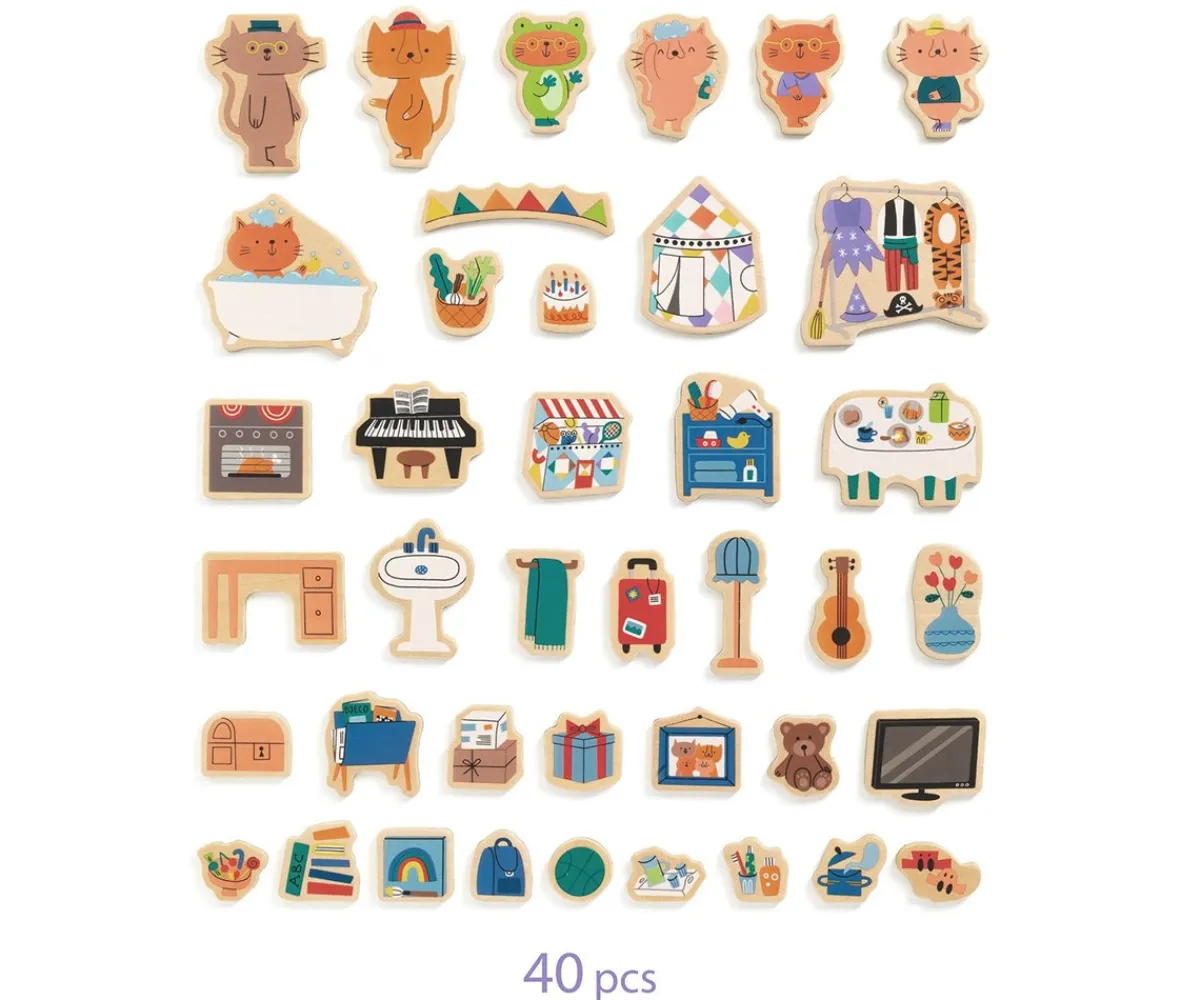 Divertida caja de metal en forma de casita, en su interior contiene 40 piezas magnéticas de madera para crear diferentes escenas de hábitos de rutina diaria. Con 6 gatos diferentes, podrás recrear historias únicas en ambas caras de la casa, estimulando la creatividad y la imaginación.