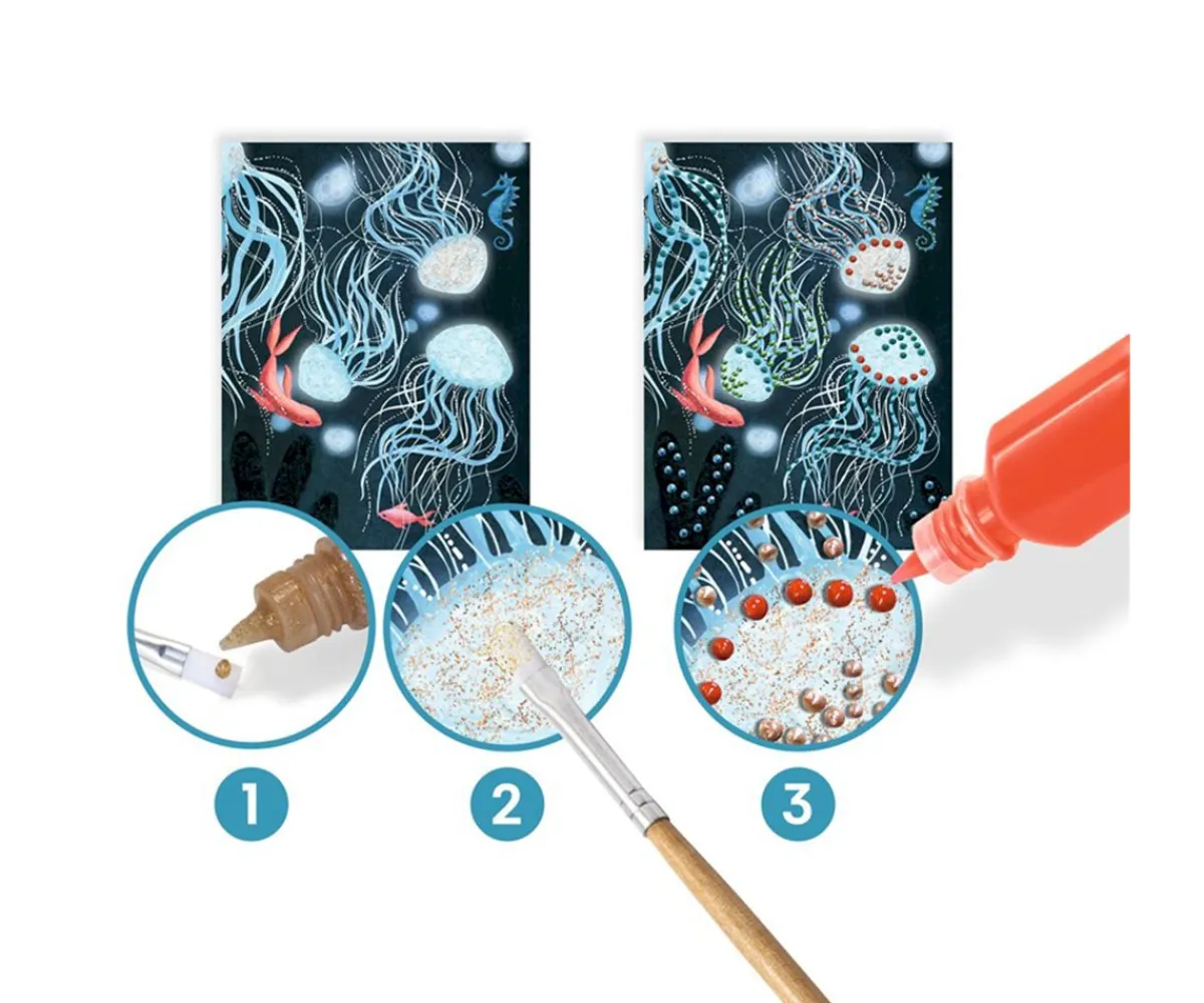 Con este kit tus peques podrán realizar 4 cuadros con la temática del mundo submarino y pintarlos en relieve gracias a las pinturas que contiene que permite pintar en 3D con efectos brillantes.