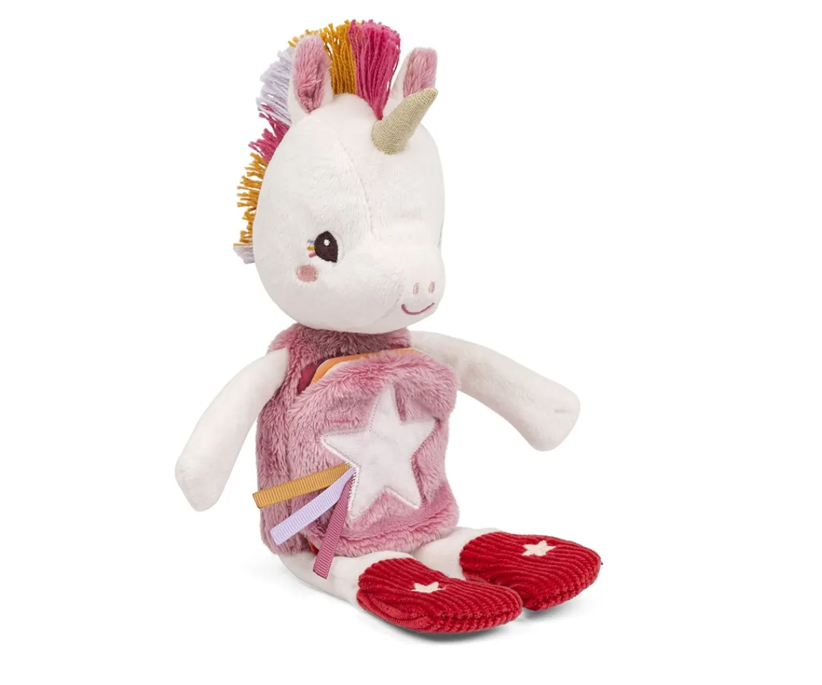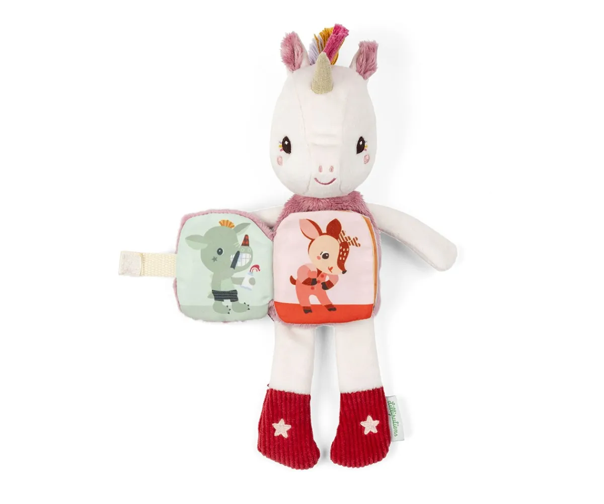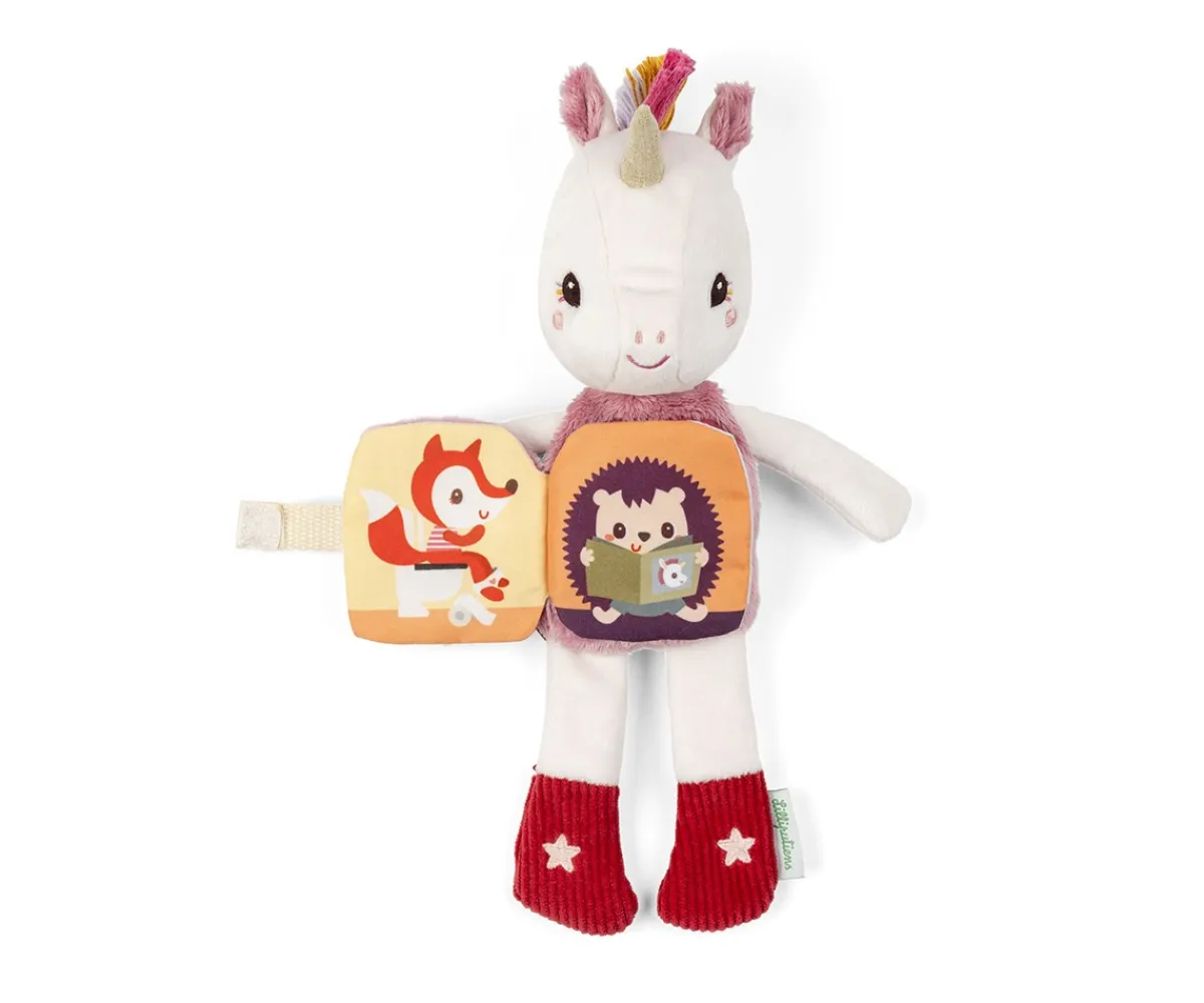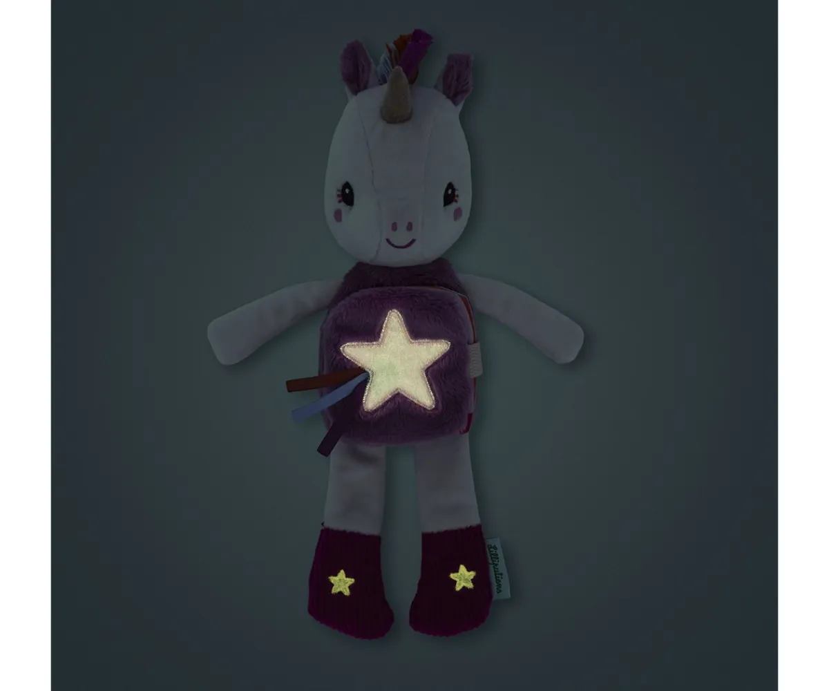 Lena, el unicornio suave y achuchable de Lilliputiens, esconde en su barriga un libro ilustrado que cuenta el ritual de la hora de dormir. Cuando se apaga la luz, las estrellas brillan suavemente para tranquilizar y velar por los dulces sueños.