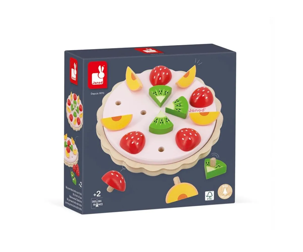 Pequeña clase de cocina para principiantes. Aquí tienes todo lo que necesitas para elaborar una fantástica tarta de frutas: una base de tarta, 5 mitades de fresas, 5 gajos de melocotón y 4 trozos de kiwi. Los más peques podrán elaborar multitud de tartas, mientras desarrollan su motricidad fina y su coordinación mano-ojo.