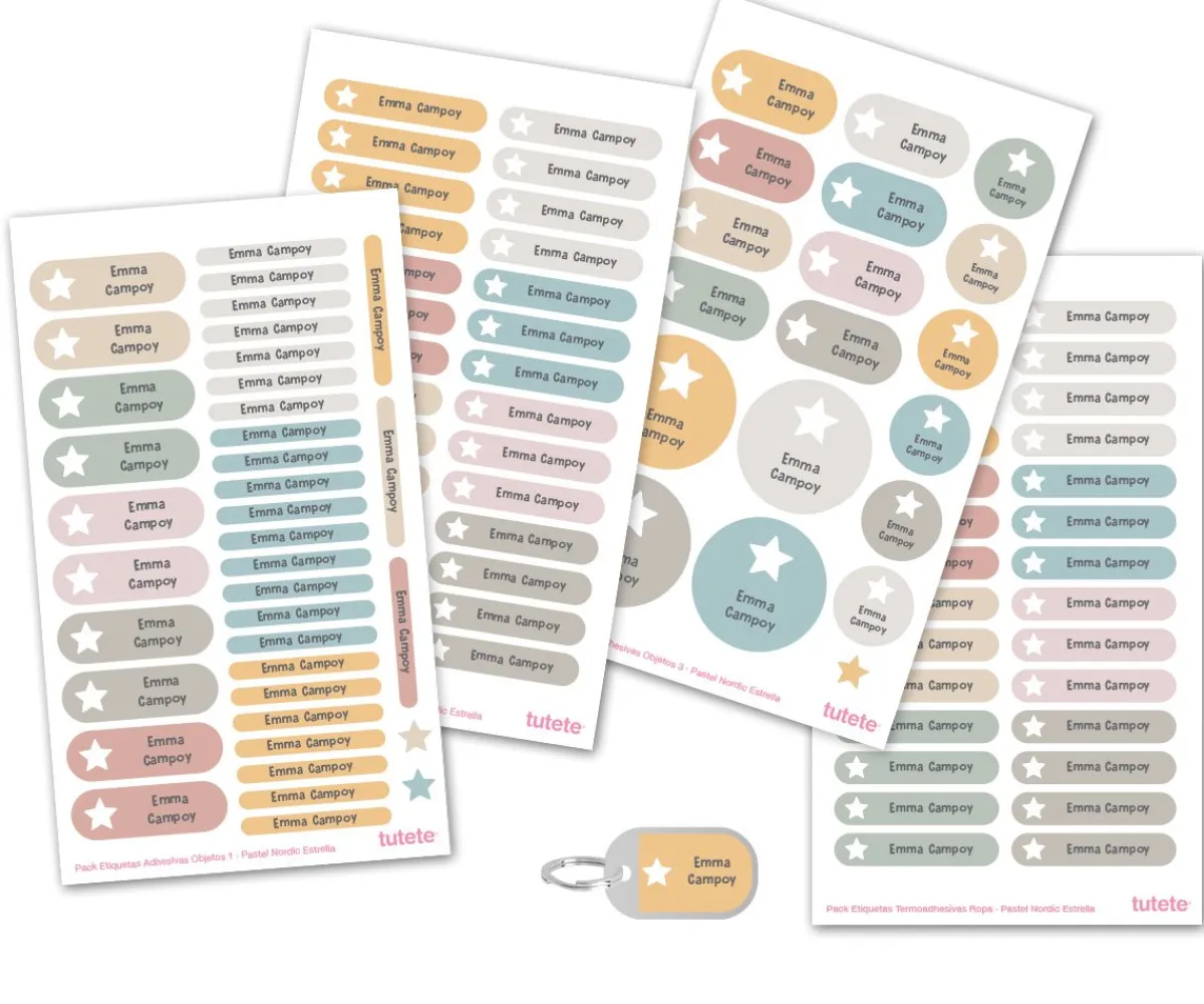 Tutete trae este pack súper práctico formado por un Sello Personalizado Estrellas con el nombre de tu peque y el pack Combinado Termo y Pegatinas Pastel Nordic Estrella.