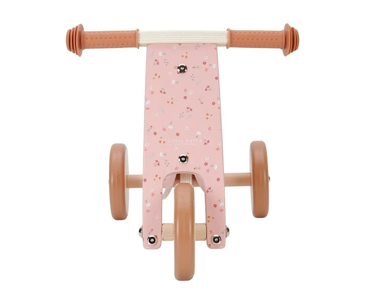 Triciclo de madera para jugar y desarrollar la motricidad y el equilibrio de los peques a partir de 12 meses de edad. Tiene un asiento resistente para brindar comodidad y estabilidad, el manillar tiene dos asas de goma para un buen agarre y las ruedas cuentan con borde de goma.