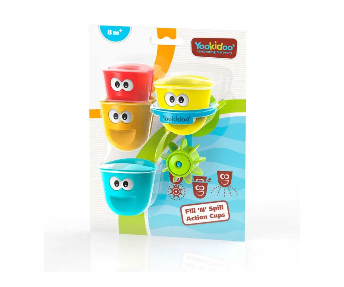 Estos tres vasitos que son intercambiables tienen cada uno un efecto de agua diferente. El portavasos se adhiere a la bañera para poder jugar, apilar los vasitos y tenerlos recogidos.