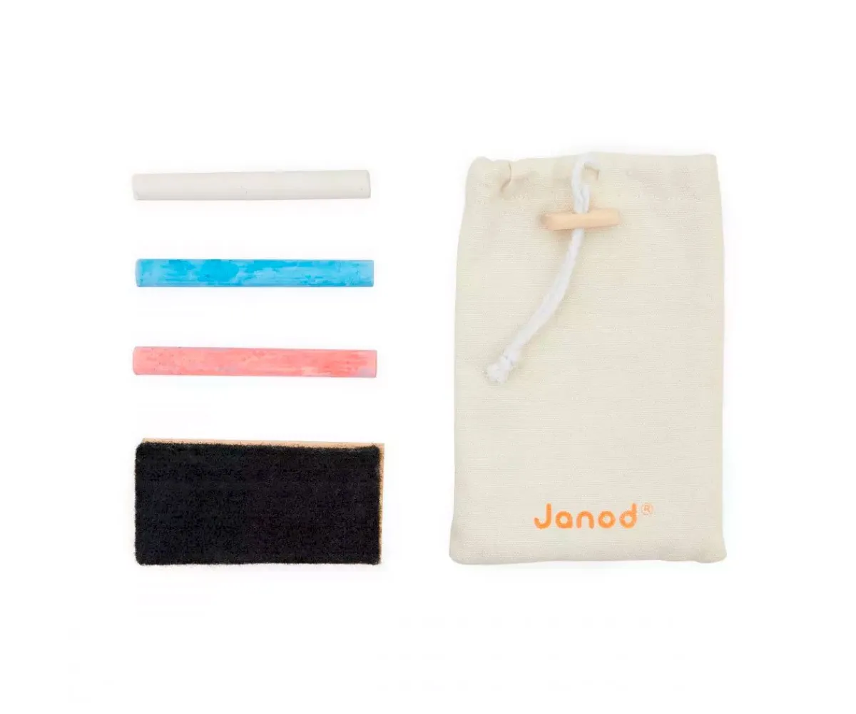 - Incluye: bolsa con tizas y borrador, y soporte de madera para fijar a la pared