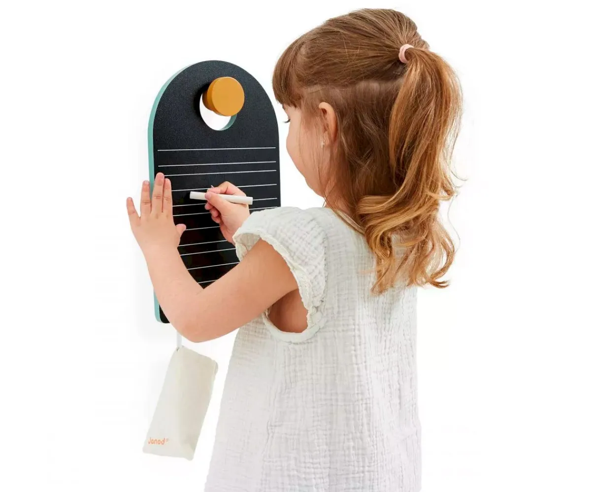 ¡Gracias al pequeño tamaño de esta pizarra móvil los peques podrán llevársela a todas partes, garantizando horas de dibujo! En el reverso tiene líneas para practicar la caligrafía Una bolsa de algodón con 3 tizas y un borrador se adhiere a la pizarra para ganar practicidad. Junto con el juguete se ofrece un soporte de madera para fijar a la pared, que permite colgarlo. De este modo, su hija o hijo podrá exponer su bonito dibujo en su habitación cuando vuelva a casa. Juguete de madera FSCTM. Juguete de madera para niños a partir de 3 años.