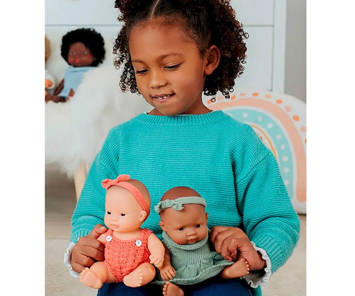 Colección de ropita y accesorios para muñeco recién nacido. Incluye las prendas y complementos más habituales en situaciones cotidianas del bebé como la hora del baño, la siesta o el paseo. Con diferentes tipos de abroches para ayudar al desarrollo de la psicomotricidad fina.