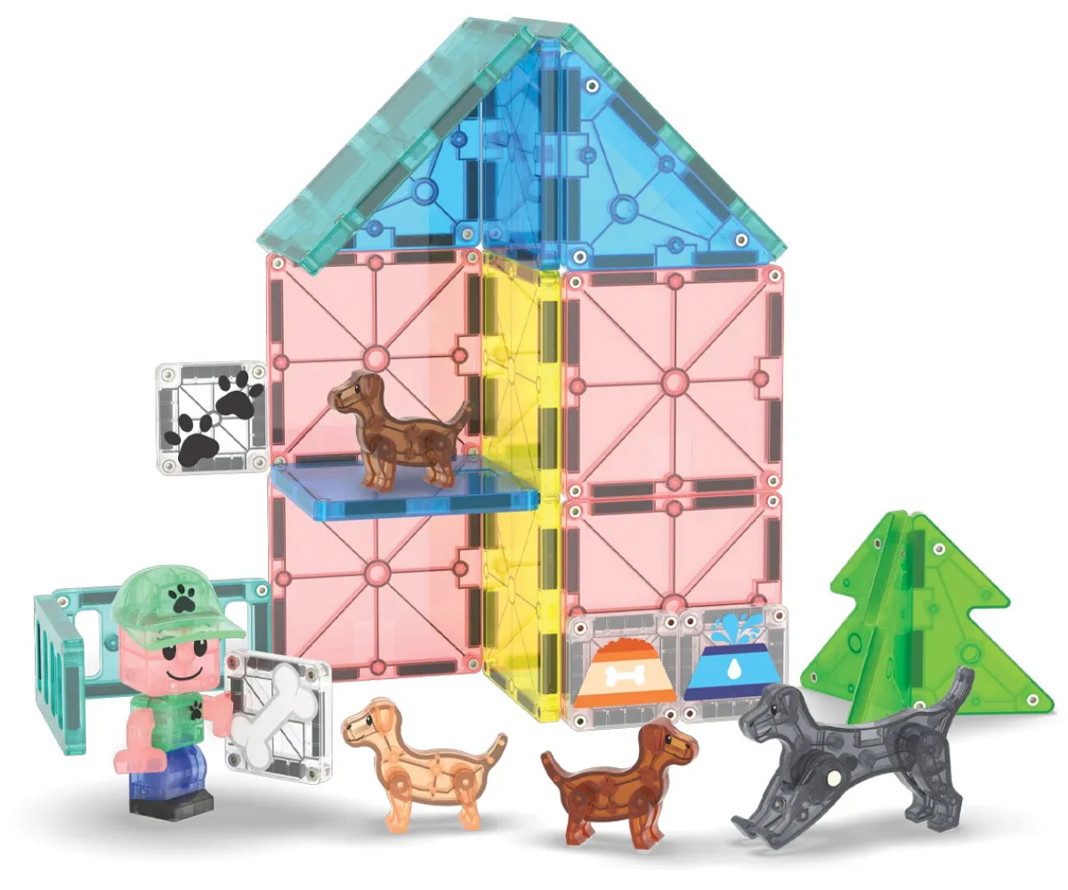 - Incluye: 1 figura de perro, 3 figuras de cachorro, 1 figura de cuidador (gorra + cabeza + cuerpo), 6 cuadrados, 2 triángulos rectos, 2 vallas, 2 rectángulos, 1 base rectangular, 3 hojas decorativas, 4 microMAGS cuadrados