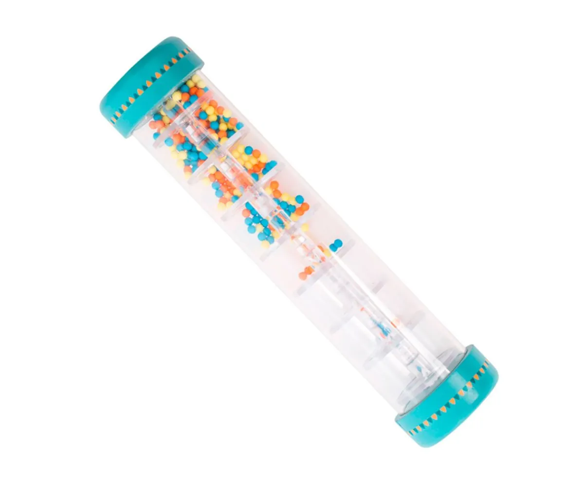 Este sencillo y divertido instrumento aporta entretenimiento y experimentación. Es un forma de estimulación visual y auditiva para los peques. Dándole la vuelta al palo caen las bolitas y genera un ruido similar a la lluvia, generando calma y relajación.