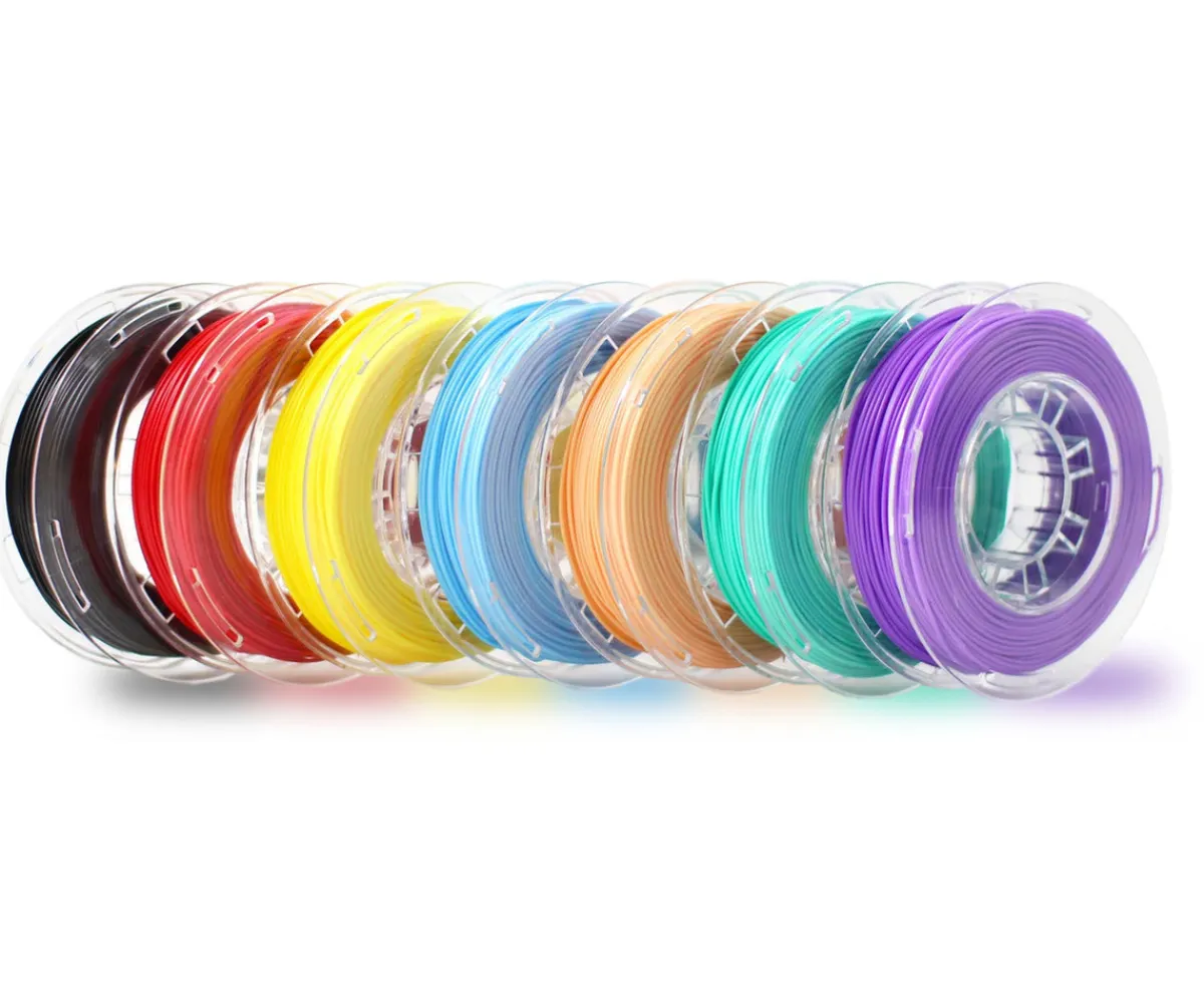 - Incluye 7 filamentos de colores para impresora 3D: Negro (Sésamo), Rojo (Cereza), Amarillo (Limón), Azul cielo (Algodón de Azúcar), Naranja Claro (Melocotón), Verde (Menta), Morado (Uva)