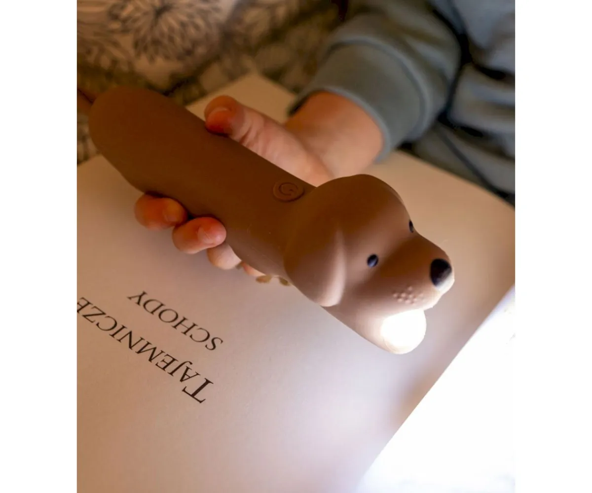 Original linterna recubierta de silicona suave con forma de perrito que los peques podrán usar en aventuras nocturnas al aire libre, en juego de sombras en casa o para contar cuentos antes de dormir.