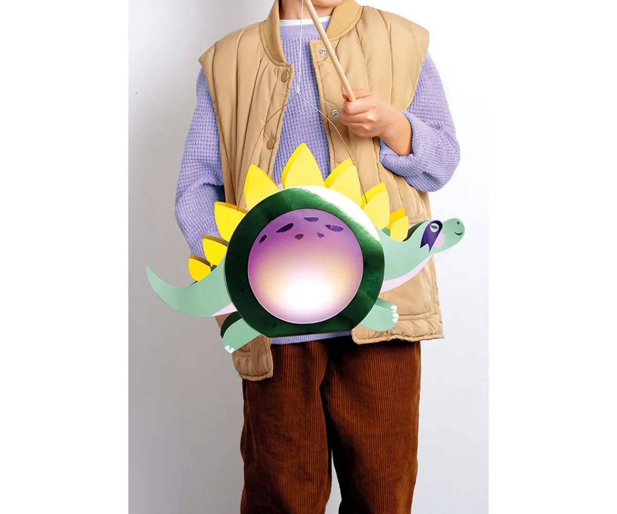 El set incluye todos los materiales necesarios para montar un farolillo con temática de dinosaurios. Cuenta con un armazón metálico verde brillante, papel translúcido y purpurina, piezas impresas en color, adhesivos 3D, alambre para sujetar, soporte para vela (vela no incluida) y un palo para sujetar el farolillo.