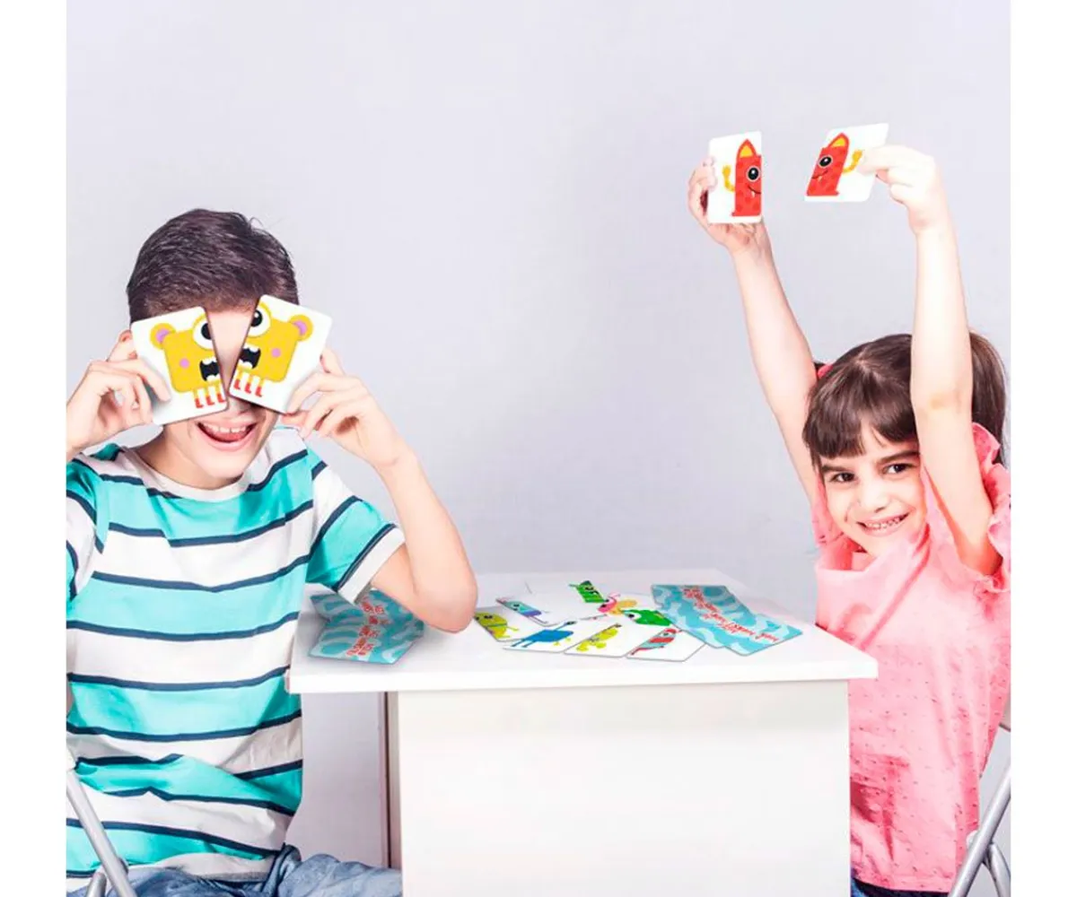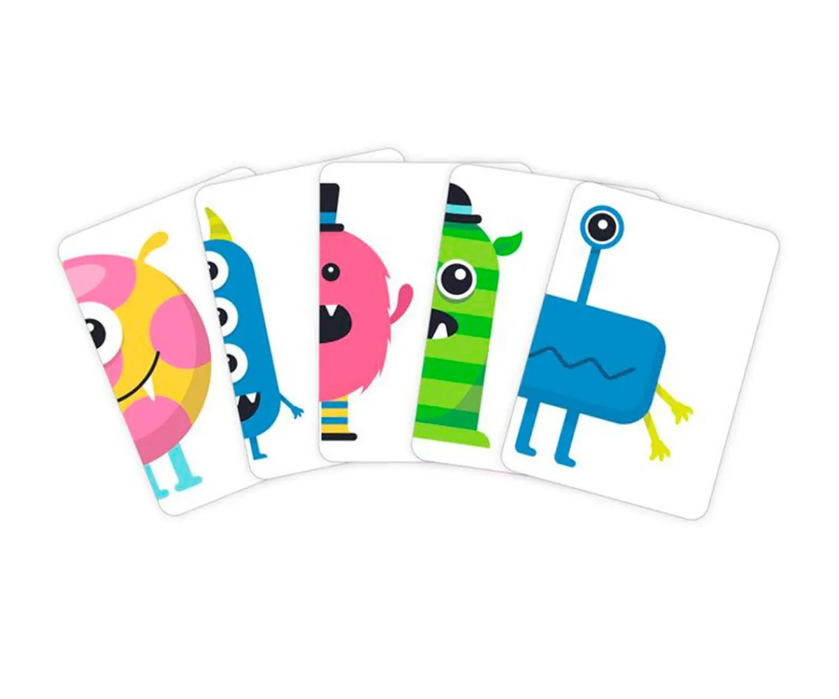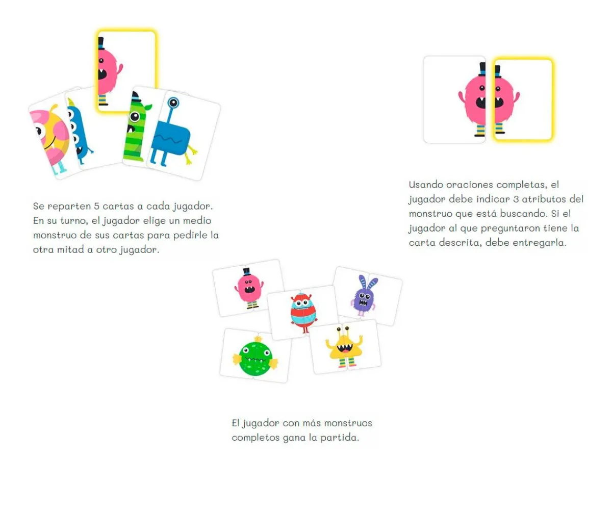 Crea tantos monstruos como puedas juntando las mitades. Los jugadores deben describir al monstruo que buscan con tres atributos diferentes: ¿Tienes un monstruo rojo con alas azules y un ojo? ¿Tienes un monstruo morado con calcetines a rayas y dos ojos? Gana el jugador con más monstruos completos.
