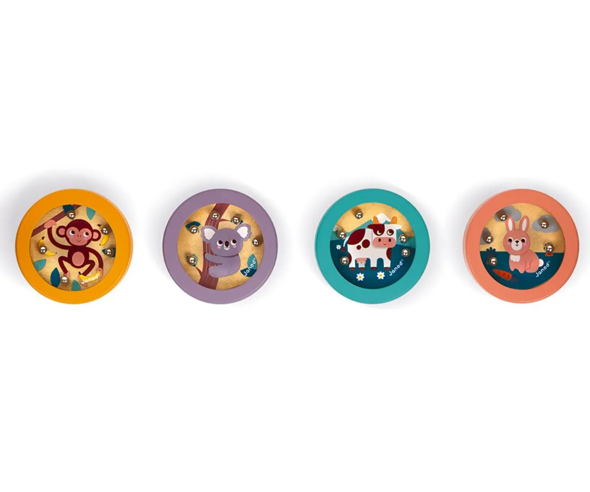 - Material: Madera certificada FSC, bolitas metálicas y plástico