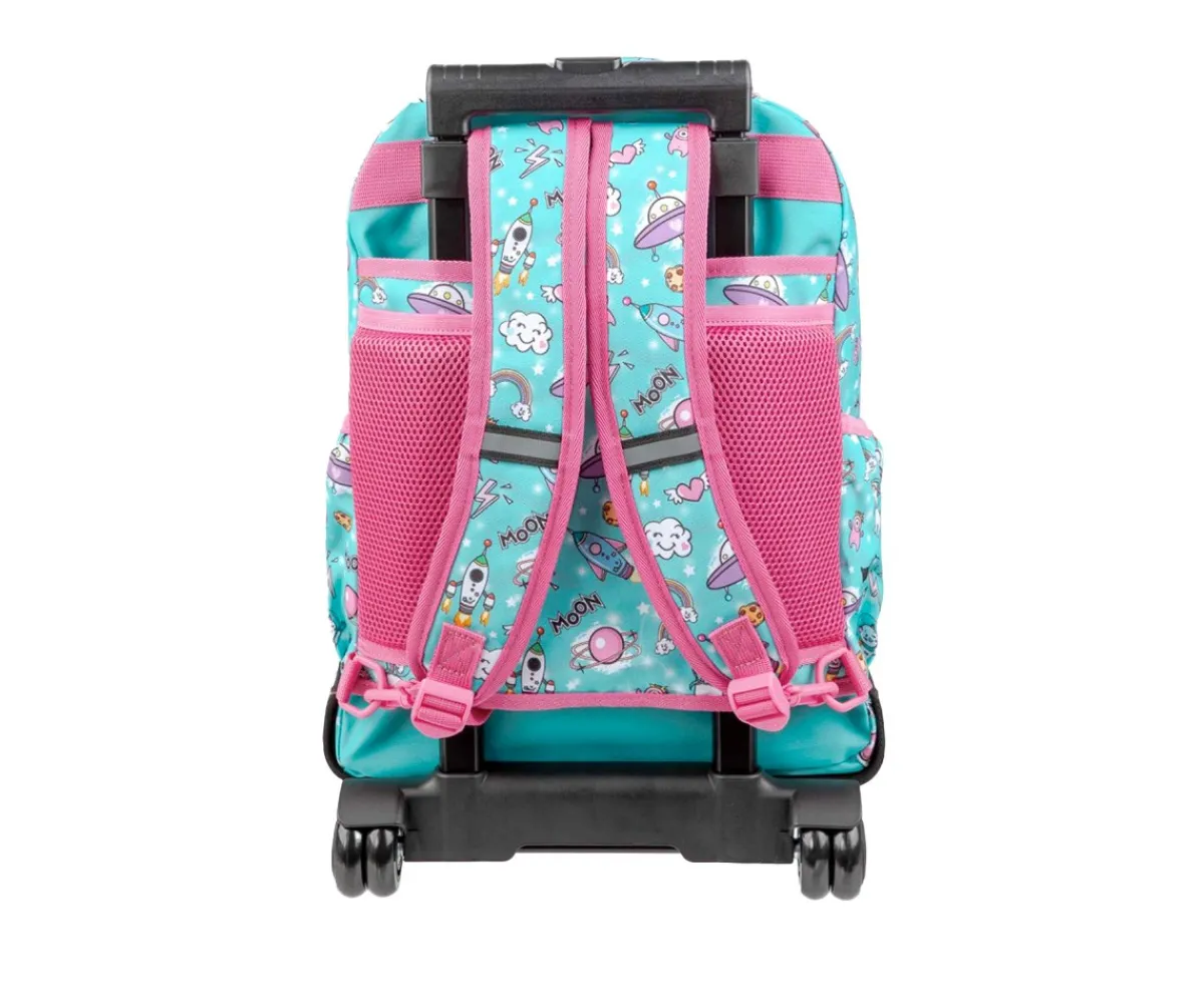 Su diseño con carro integrado, doble barra y tirantes acolchados la hace muy versátil, perfecta tanto para llevarla rodando como a la espalda. Cuenta con dos compartimentos principales de gran tamaño, su base es rígida y resistente, protegiendo el contenido contra golpes, mientras que los dos bolsillos laterales permiten llevar botellas de agua de forma segura.
