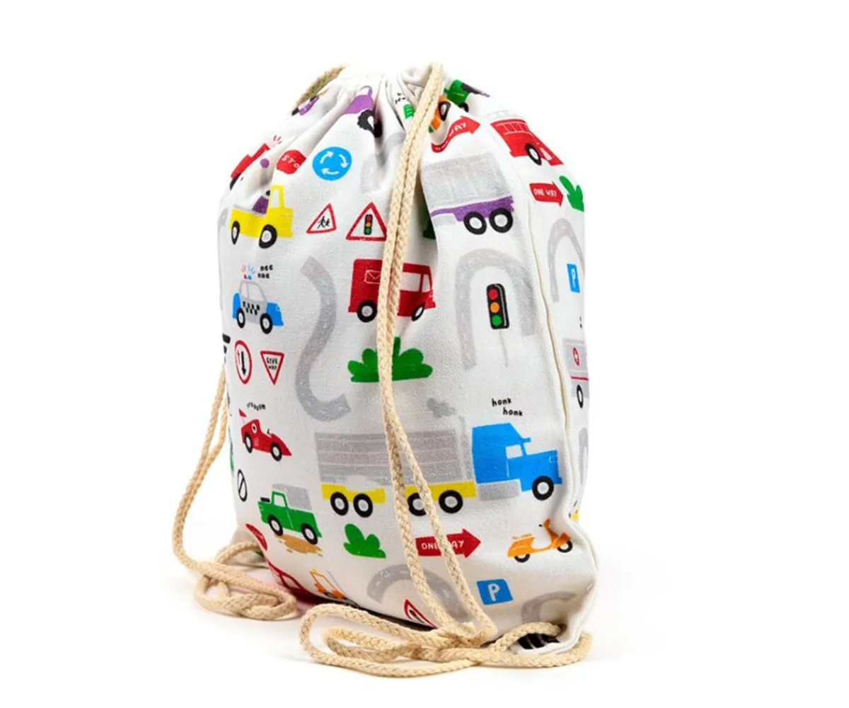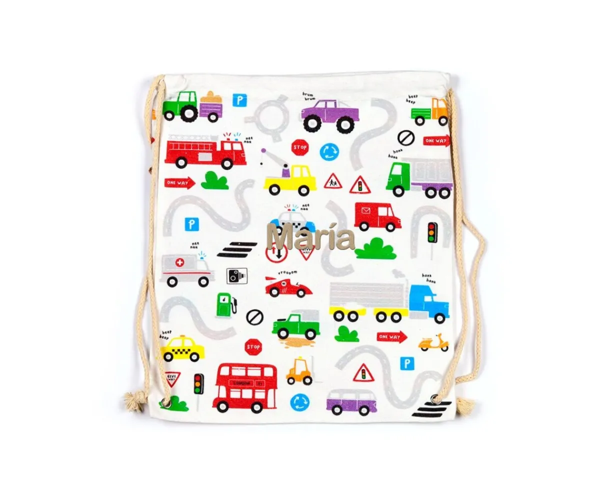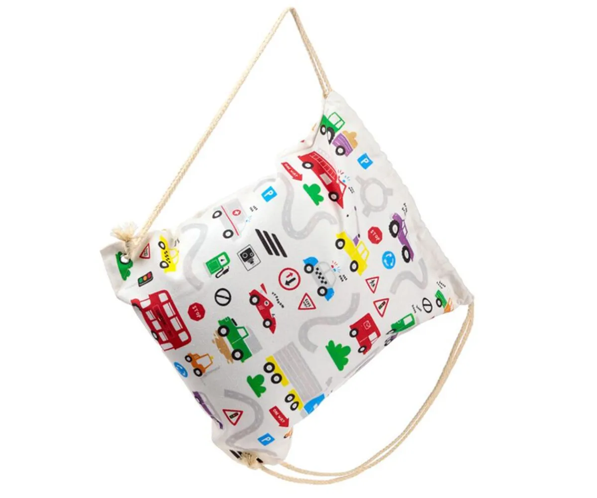 Mochila saco de Puckator con diseño de coches, señales y carreteras. Perfecta para llevar la merienda, el almuerzo o una muda al cole o de excursión.
