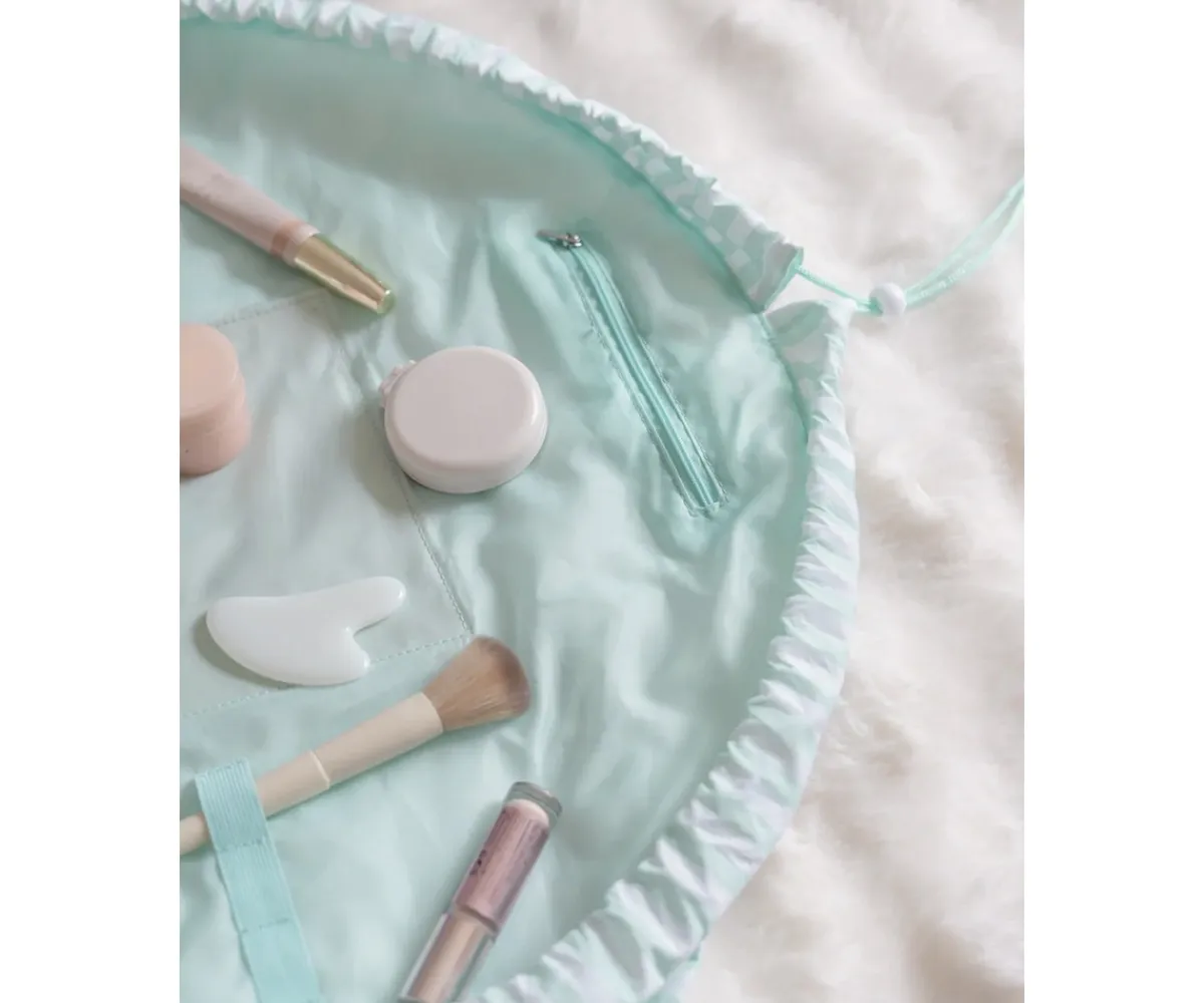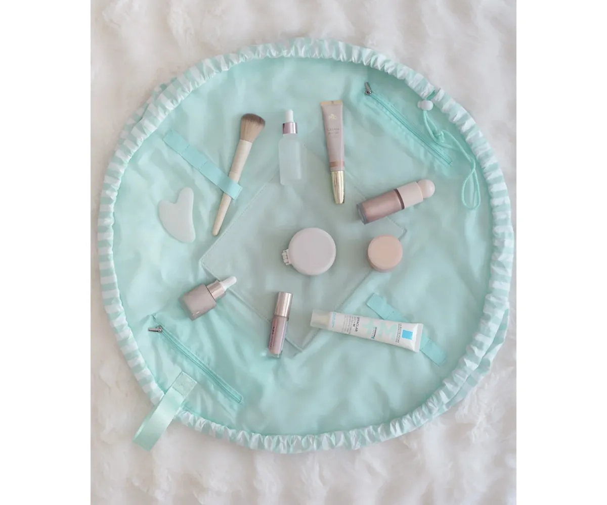 Neceser de maquillaje y cosmética color aguamarina, estilo bolsa con cordón ajustable. El accesorio perfecto para irte de viaje, ya que puede abrirse por completo para tener a la vista todo su contenido.