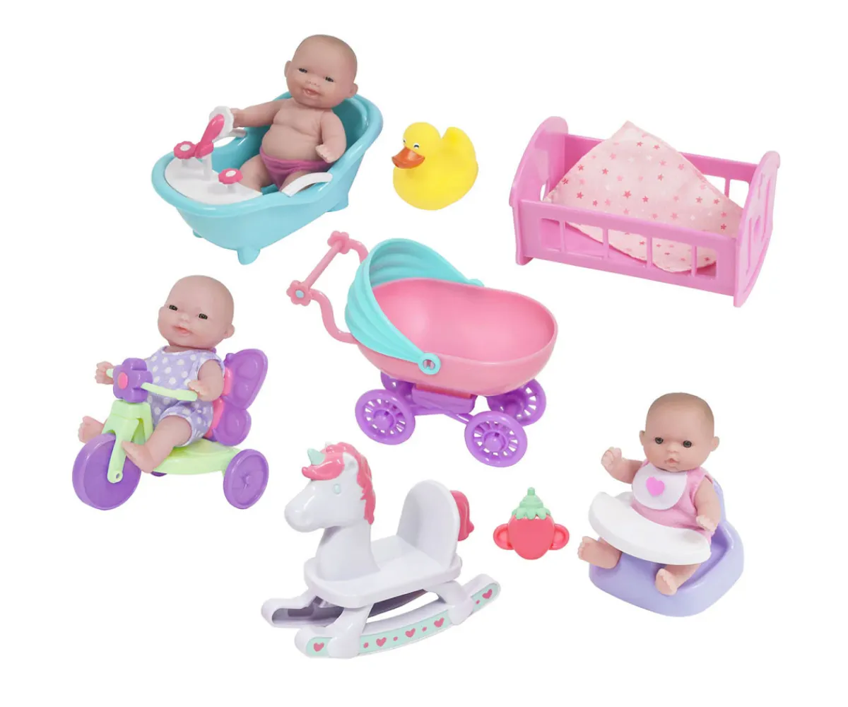 - Incluye: 3 muñecas de 13cm, cuna, bañera, caballo balancín, triciclo, carricoche, trona, patito de goma