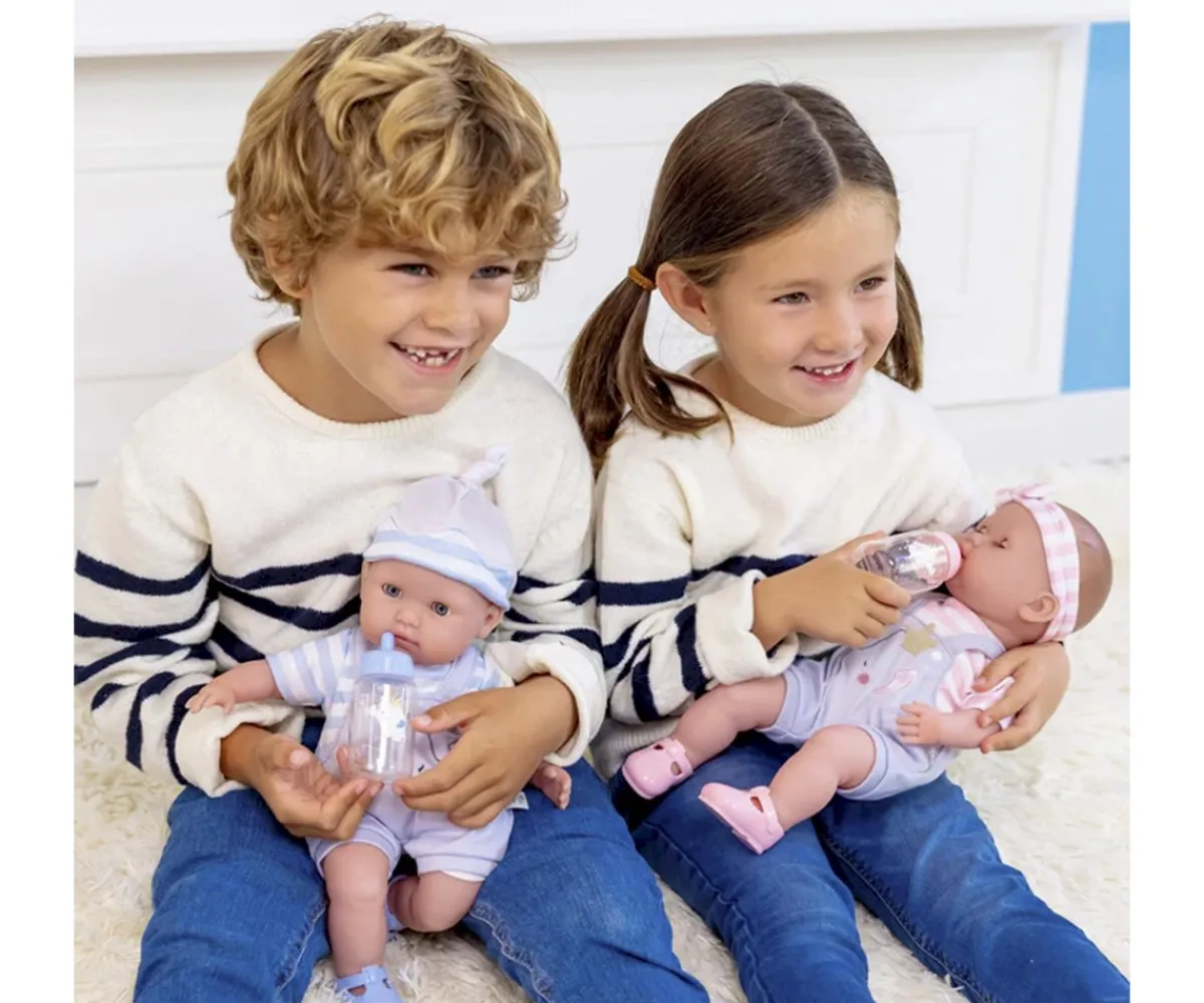 - Incluye: 2 muñecos, 2 conjunto de ropa, 2 mantitas, 2 biberones, 2 pares de zapatos y 2 chupetes