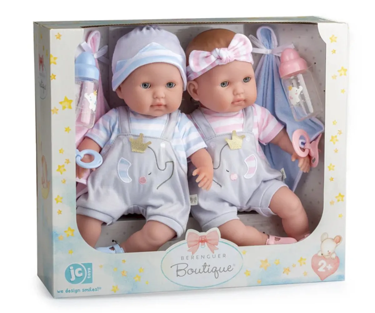 Los muñecos gemelos Berenguer Boutique de JC Toys son perfectos como primer bebé para los más pequeños. Con detalles realistas y ojos que se abren y cierran según la posición.