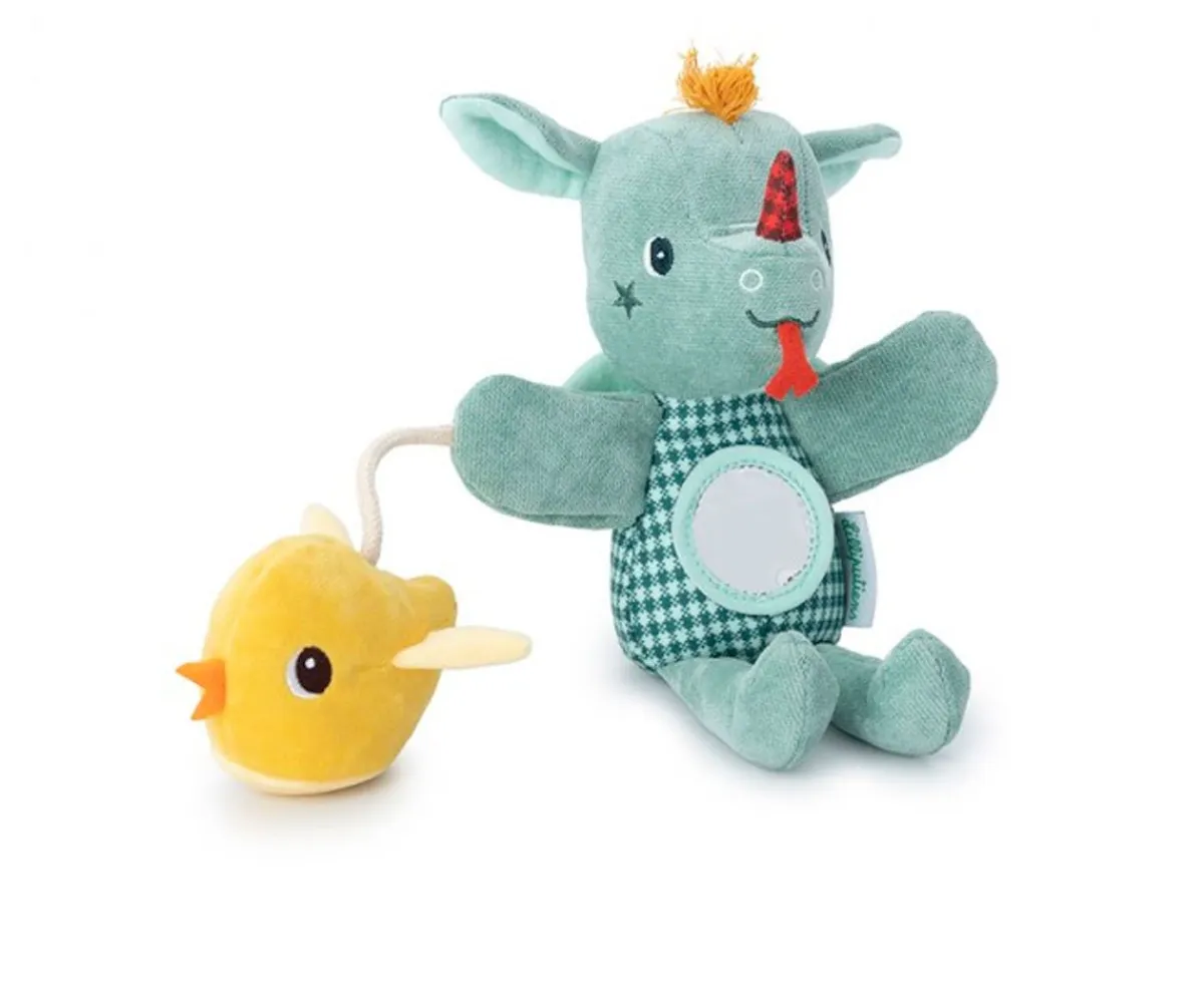 Esta preciosa y suave marioneta de Joe el dragón está acompañado de su amigo el pajarito, y será el pasatiempo preferido de los más peques. El pajarito suena al apretarlo, y en la cabecita de Joe hay un sonajero que suena al moverlo, despertando los sentidos de los peques.