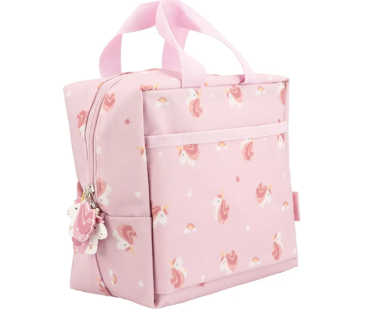Tiene 2 asas cortas, para fácil transporte, y un bolsillito exterior donde puedes guardar cubiertos o pequeños objetos que necesites tener más a mano, que se puede personalizar con el nombre.
