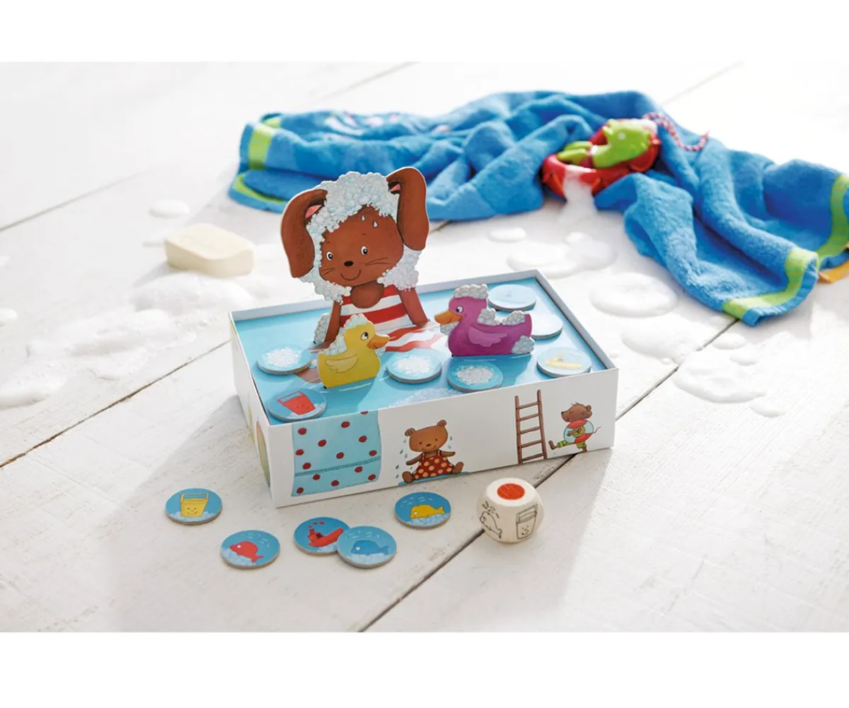 - Contiene: 1 bañera, 1 soporte de cartón en cruz, 1 superficie del agua, 1 Conejito Burbuja, 2 patos, 12 fichas, 1 dado, 1 instrucciones del juego
