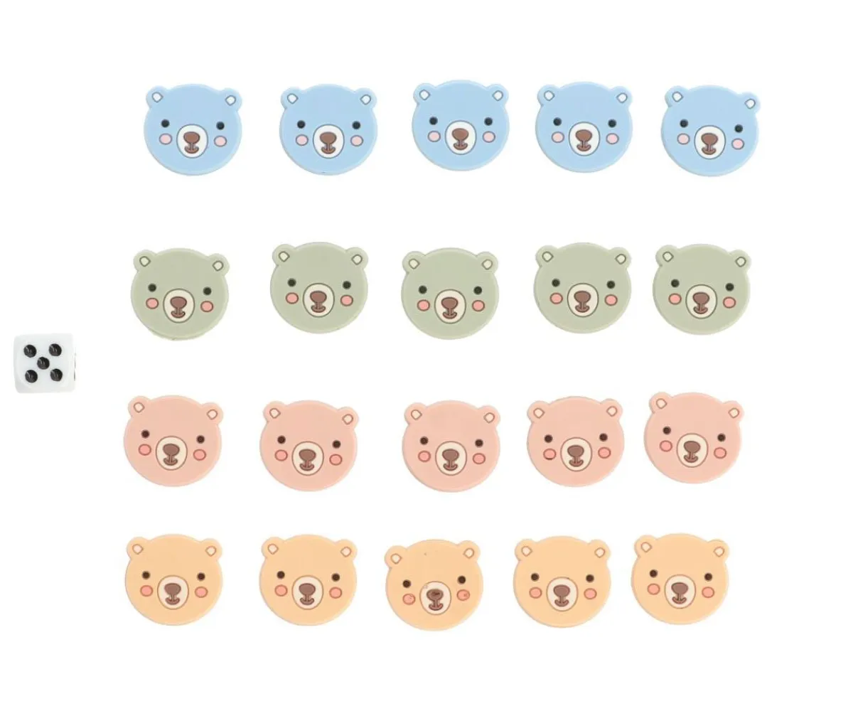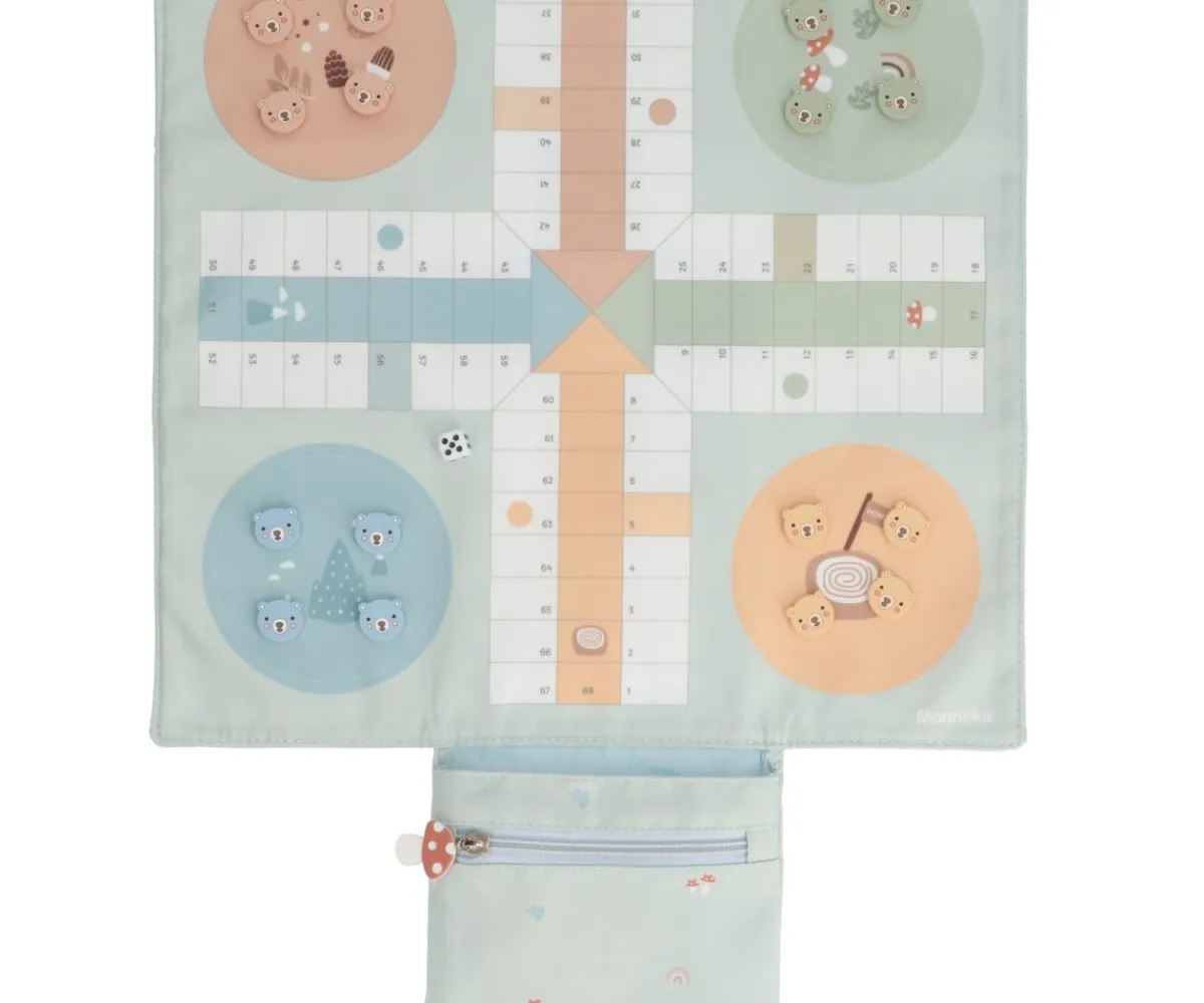 El tablero de tela se pliega fácilmente para introducirlo en el bolsillo funda que lo contiene. Además incluye un bolsillito con cremallera para guardar las preciosas fichas con cabecita de ositos de colores y el dado incluído.