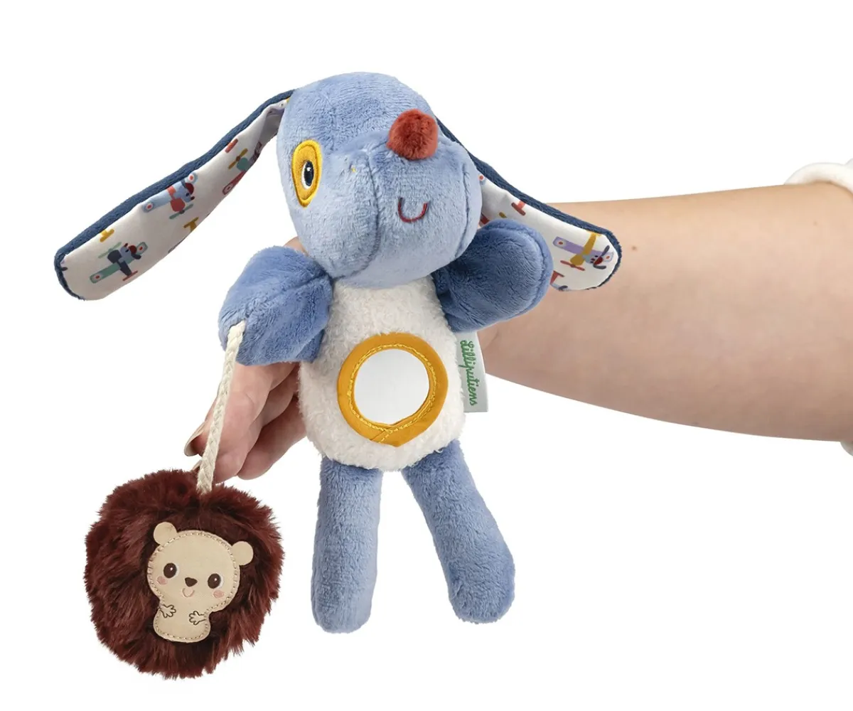 ¡Jules el perrito de Lilliputiens, cobra vida cuando lo animas con los dedos! Emite un suave sonido de sonajero que despierta al bebé con dulzura y tiene un espejo sensorial en la barriga. Su amigo de tela, el erizo, añade una sorpresa con un sonido crujiente. Gracias a su tamaño compacto, se guarda fácilmente para entretener al bebé en cualquier momento.