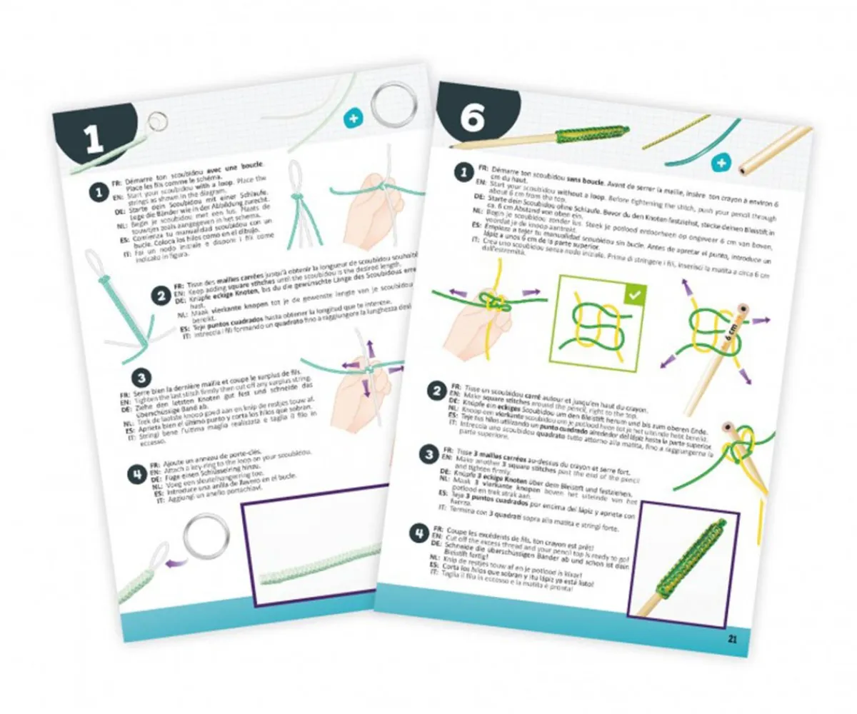 - Incluye: 55 cuerdas scoubidou, 15 llaveros, 2 lápices e instrucciones ilustradas