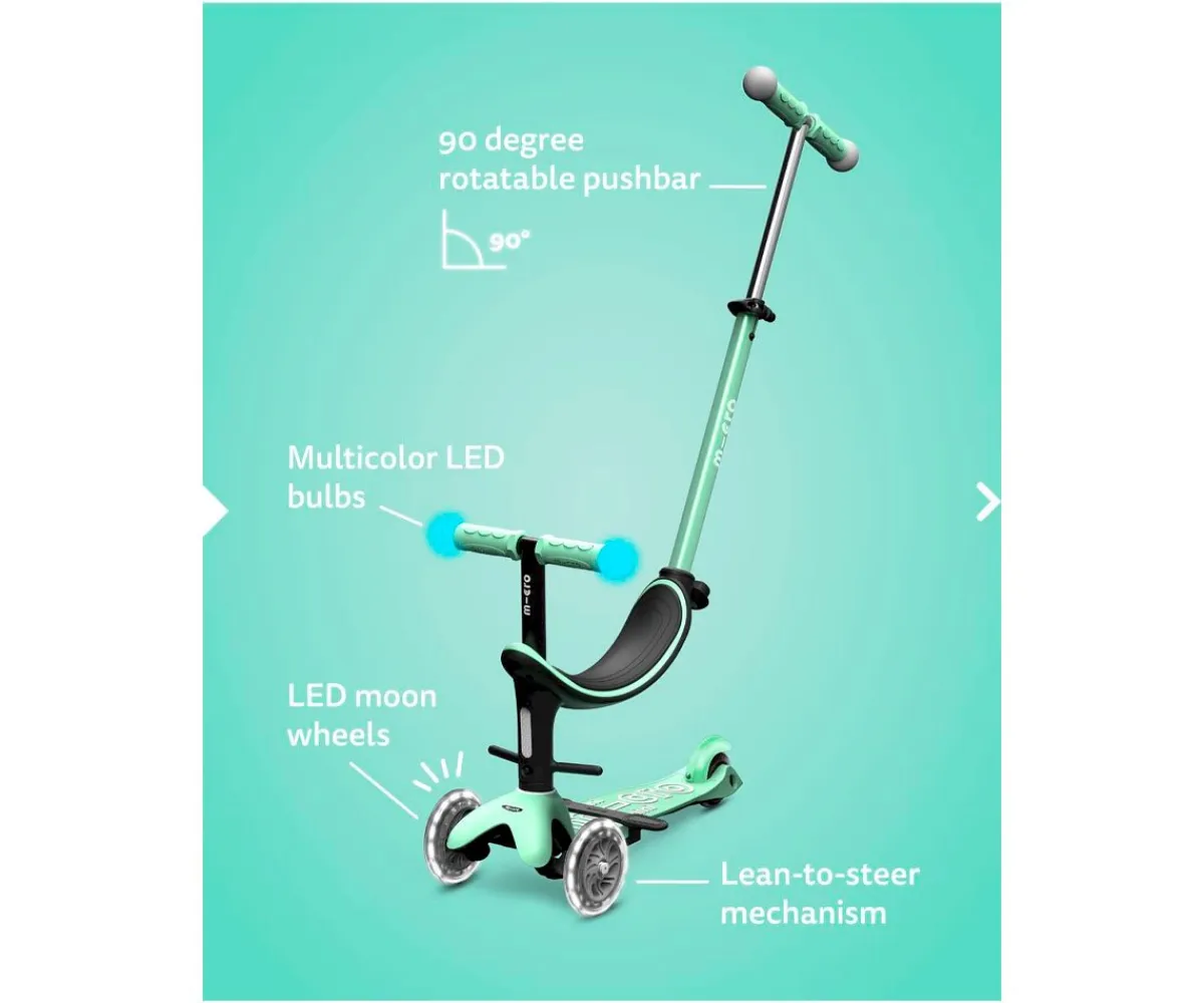 El Micro Mini2Grow es el compañero perfecto para los peques desde los 12 meses. Se puede utilizar en diferentes variantes: con asiento, dos opciones de reposapiés y barra de empuje para los padres y sin barra de empuje, como una mezcla entre bicicleta de equilibrio y patinete, y finalmente como un Mini Micro Deluxe clásico con luces LED mágicas en los extremos del manillar y ruedas lunares LED.
