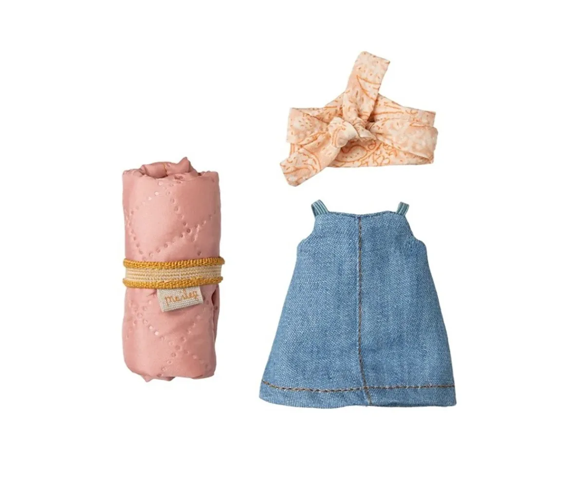 - Incluye: ratoncita hermana mayor, mono vestido vaquero, diadema y saco de dormir