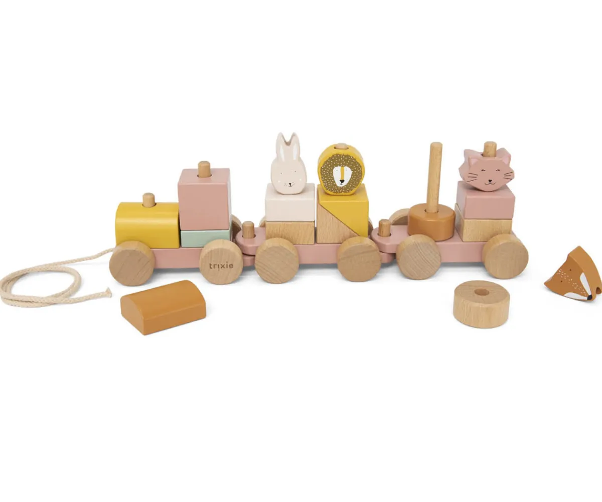 Sube al tren con nuestros adorables amigos animales! El tren de madera de Trixie es un juguete educativo y creativo que combina diversión, desarrollo de habilidades motoras y juego imaginativo. Incluye bloques de diferentes colores que permiten a los niños crear sus propios vagones, fomentando la creatividad y la coordinación ojo-mano mientras juegan.