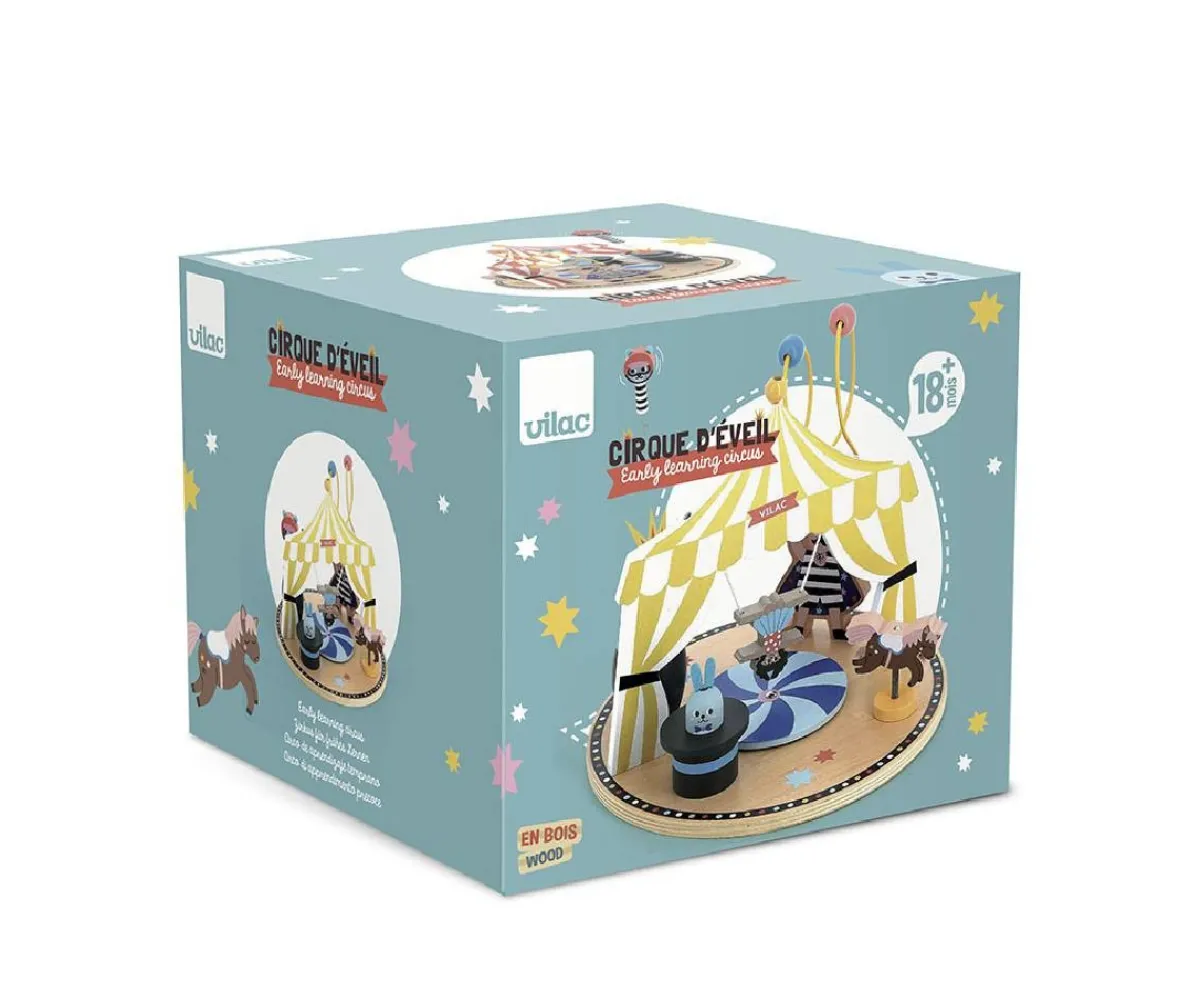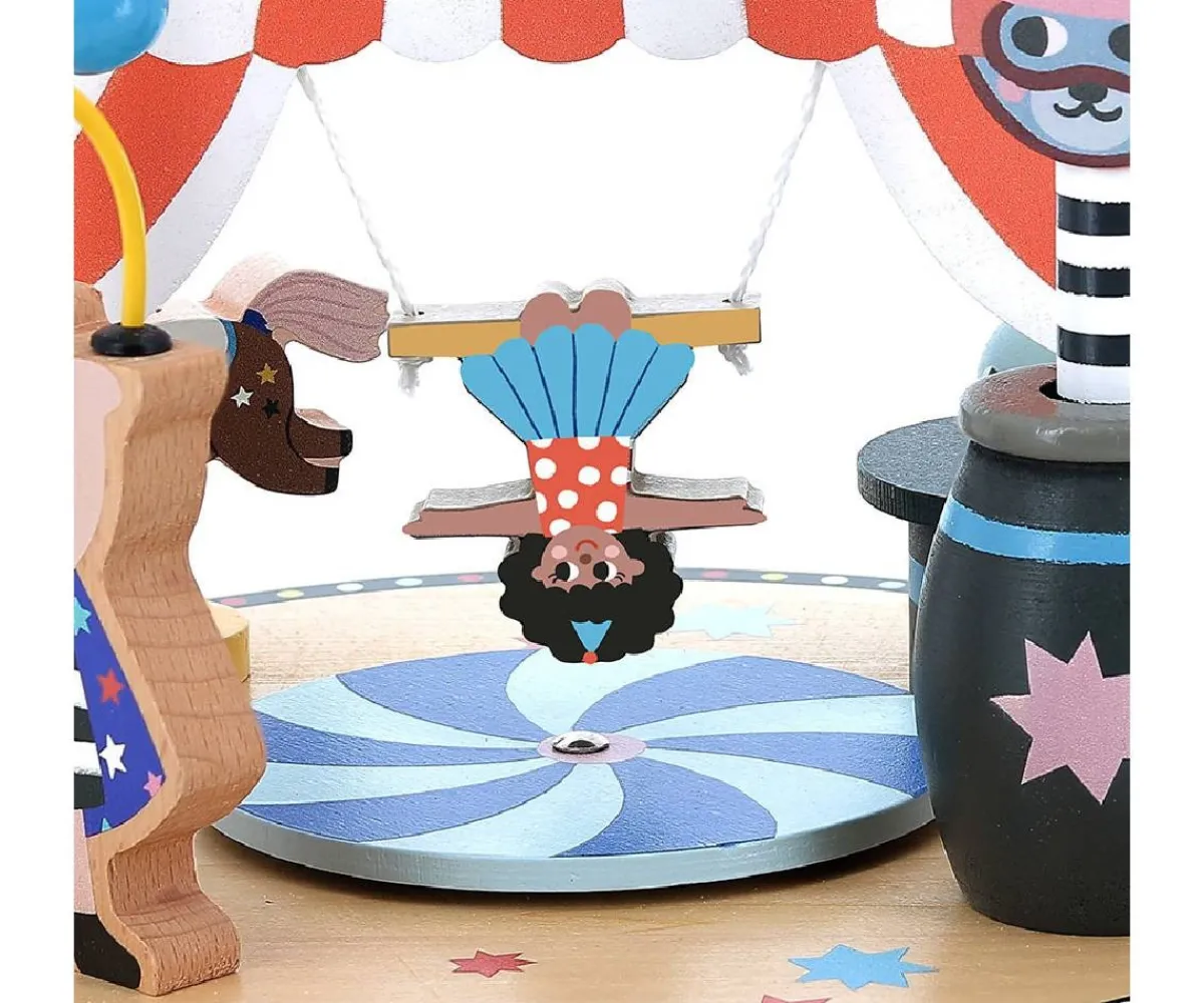 - Incluye: base circo madera y 6 actividades: pop-up, alambre metálico, conejito chillón, ruleta de ilusión óptica, caballo de resorte, acróbata de cuerda floja