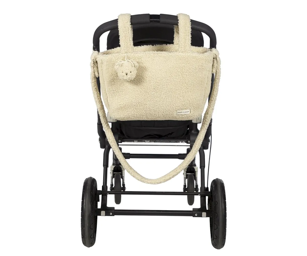El bolso organizador o crossbody Paddington de Pasito a Pasito elaborado en borreguito beige, es un modelo muy ligero, resistente y espacioso para que puedas llevar todo lo que podrías necesitar durante el paseo de tu bebé.