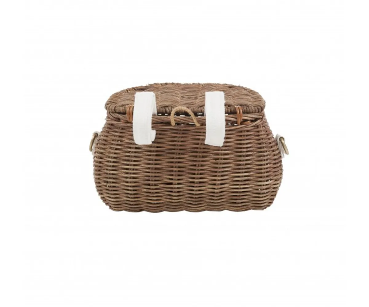 Tejido a mano de ratán con una pequeña tapa, con trabillas de lona regulables (para ponerlas a patinetes o bicicletas) y una correa larga ajustabe con herrajes de latón para llevar colgado.