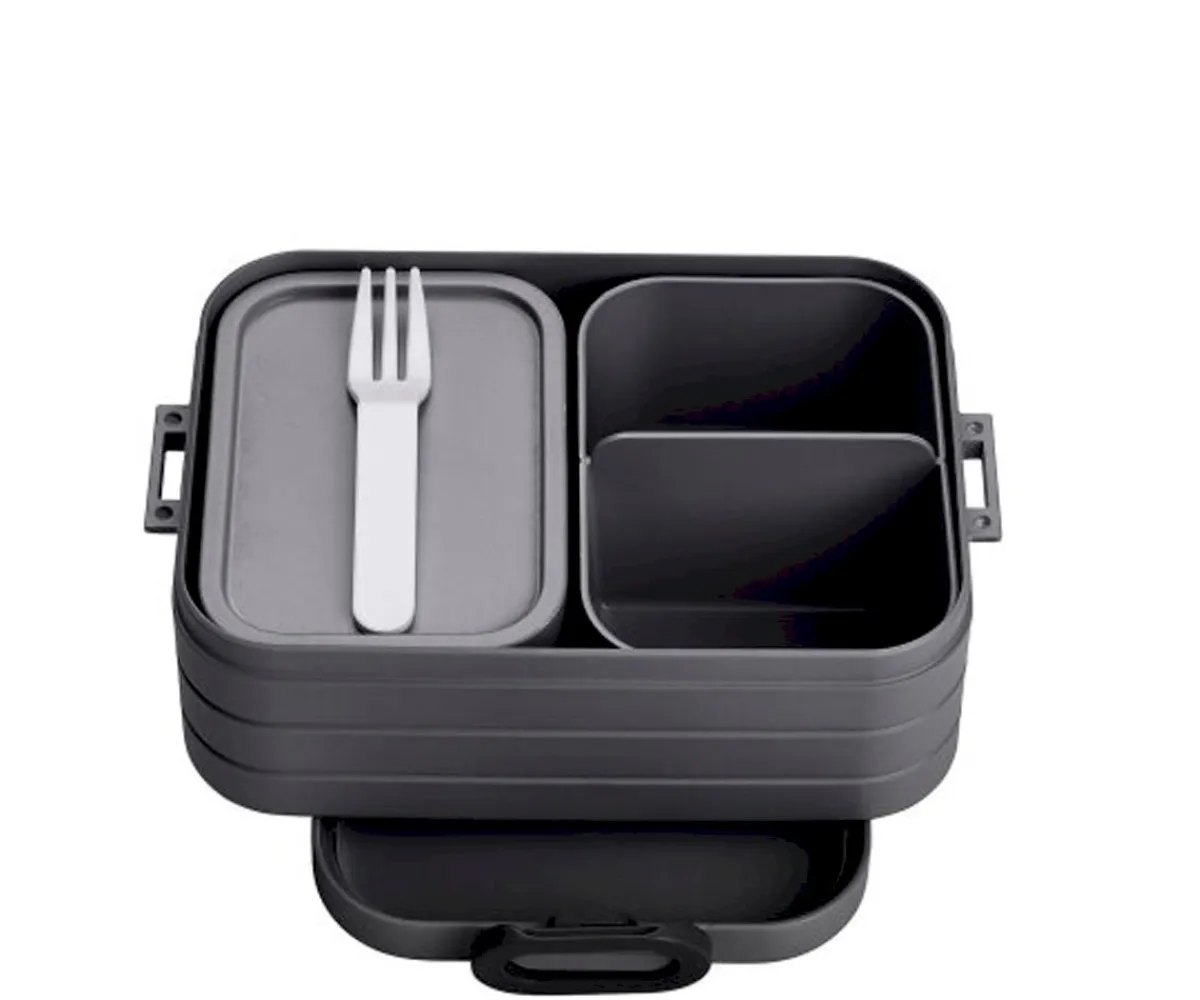 Una cajita pequeña con tenedor y un separador de 2 alimentos.