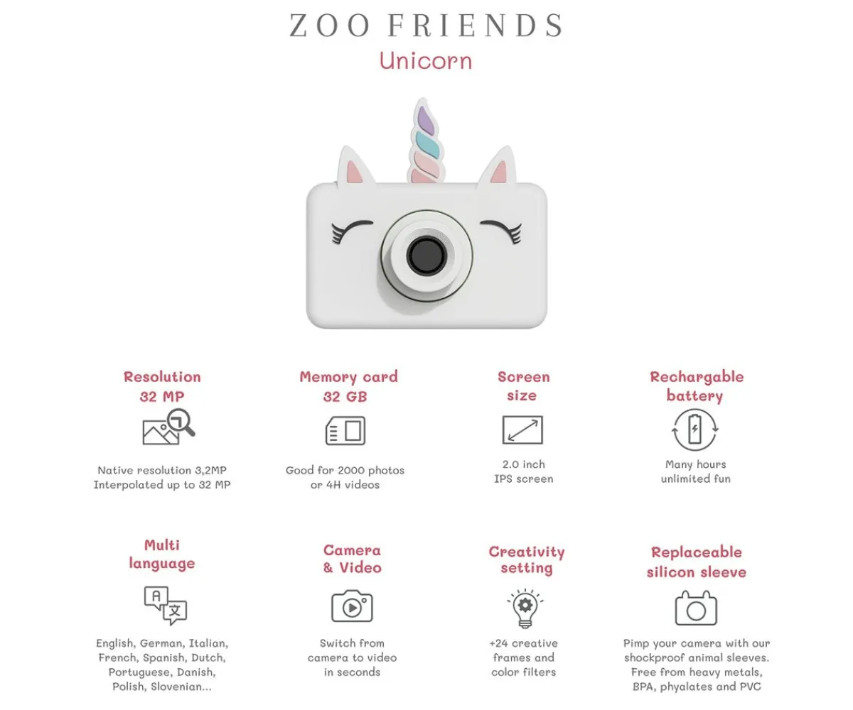 La cámara digital para niños Zoo Friends de The Zoofamily con 32 megapíxeles y grabadora de vídeo, tiene un adorable diseño de unicornio. Es pequeña, pesa poco e incluye más de 20 filtros y marcos digitales.