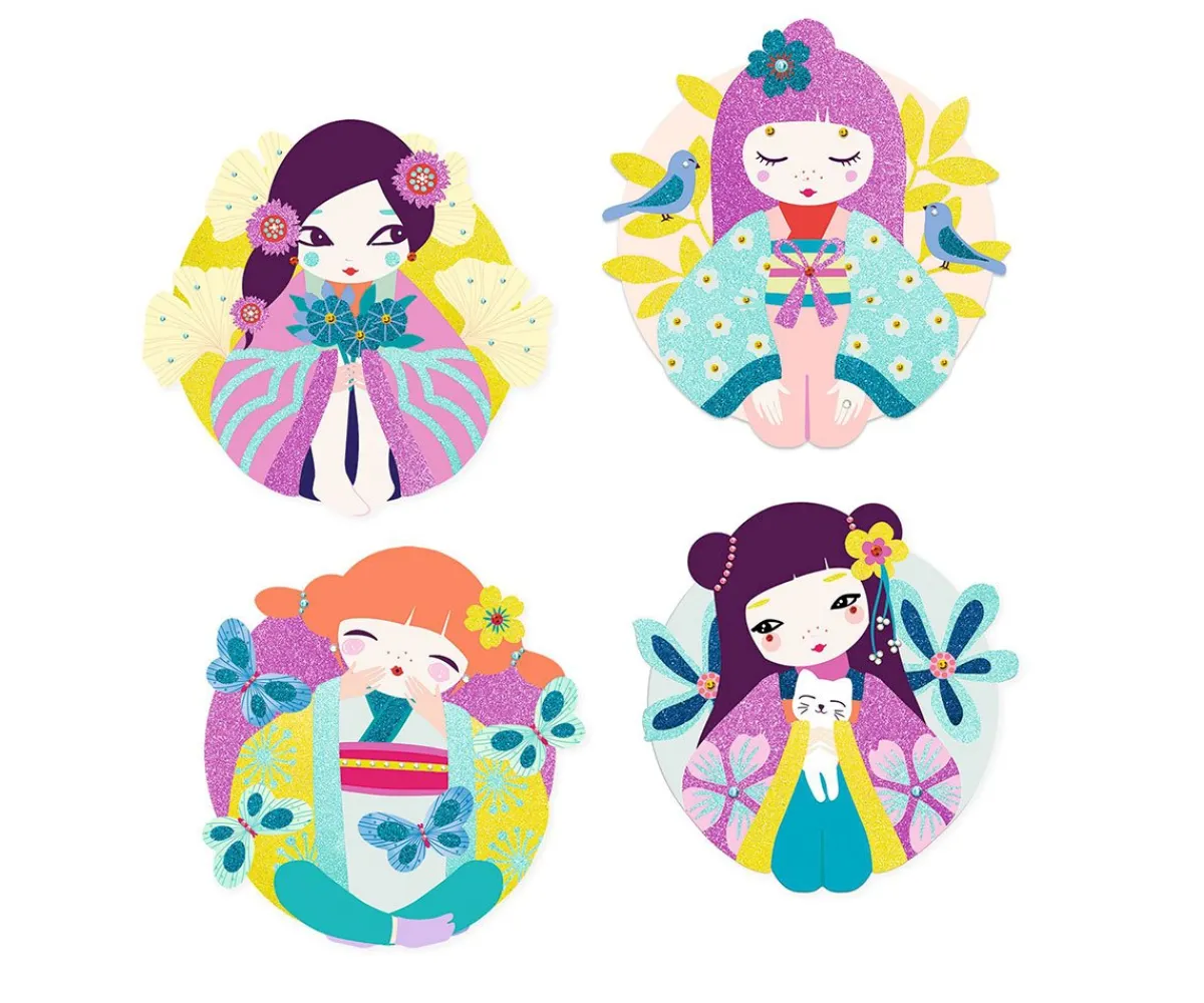 - Incluye: 4 tarjetas impresas y con adhesivos de forma redonda (21 cm de diámetro), 4 tubos de purpurina, 1 juego de mini lentejuelas, 1 herramienta de plástico, 1 pincel brocha, 4 ganchos adhesivos, 1 folleto explicativo