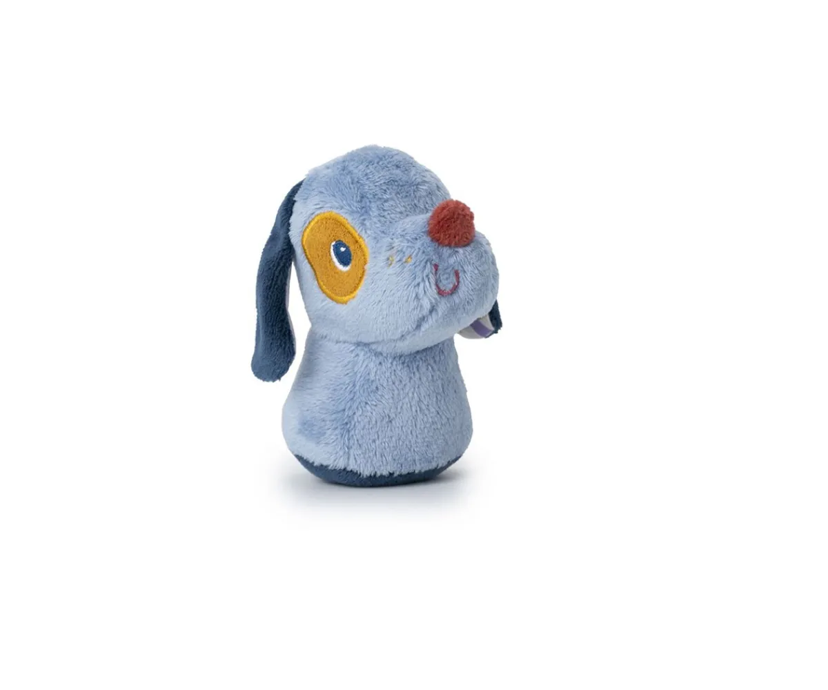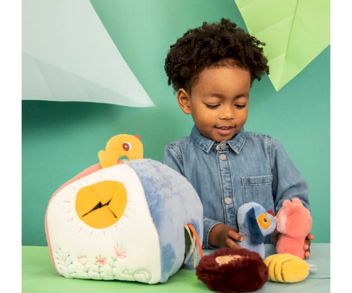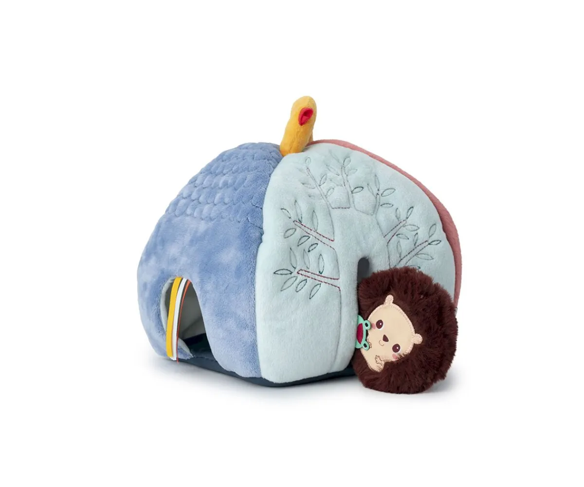 Esta colorida casita suave y blandita, tiene cuatro aberturas, cada una con un amigo diferente: perro, gato, erizo y abeja, que son sonajeros con sonidos únicos. Cada personaje se asocia con un color o ilustración, permitiendo a los niños emparejar y asociar mientras juegan. En la parte superior, un asa en forma de pájaro la hace fácil de transportar.