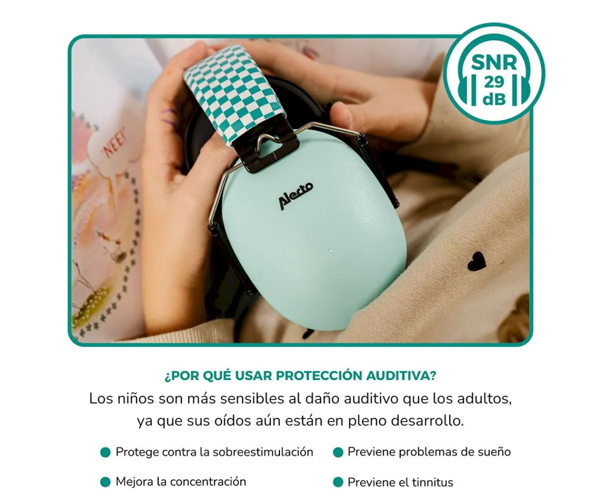 El protector auditivo amortigua los ruidos dañiños, pero permite a los peques escuchar el ruido ambiental (amortigua 29 dB SNR).