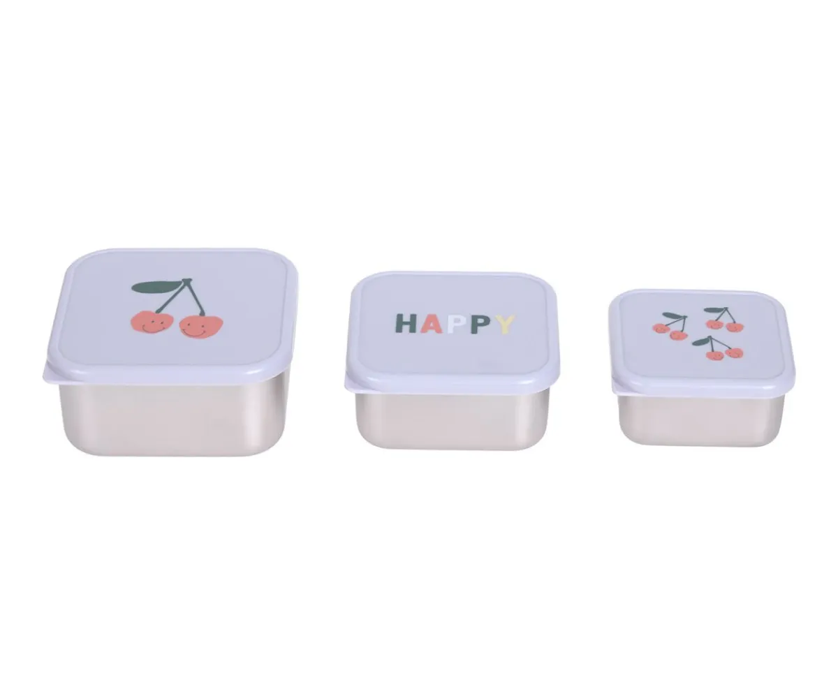 El set de 3 cajas con base de acero inoxidable de LÄSSIG para llevar fruta, verdura y pequeños snacks son ideales para llevar contigo al cole, de excursión o al parque.