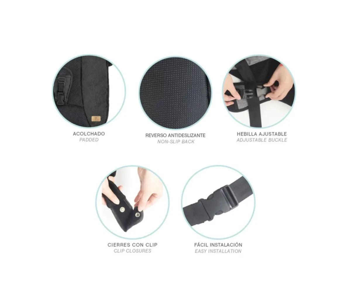 Adaptador de cinturón de seguridad para embarazadas fácil de colocar y de ajustar, además, se adapta a las diferentes etapas del embarazo. Los puntos de fijación permiten que la banda inferior del cinturón quede por debajo del abdomen evitando que éste quede presionado.