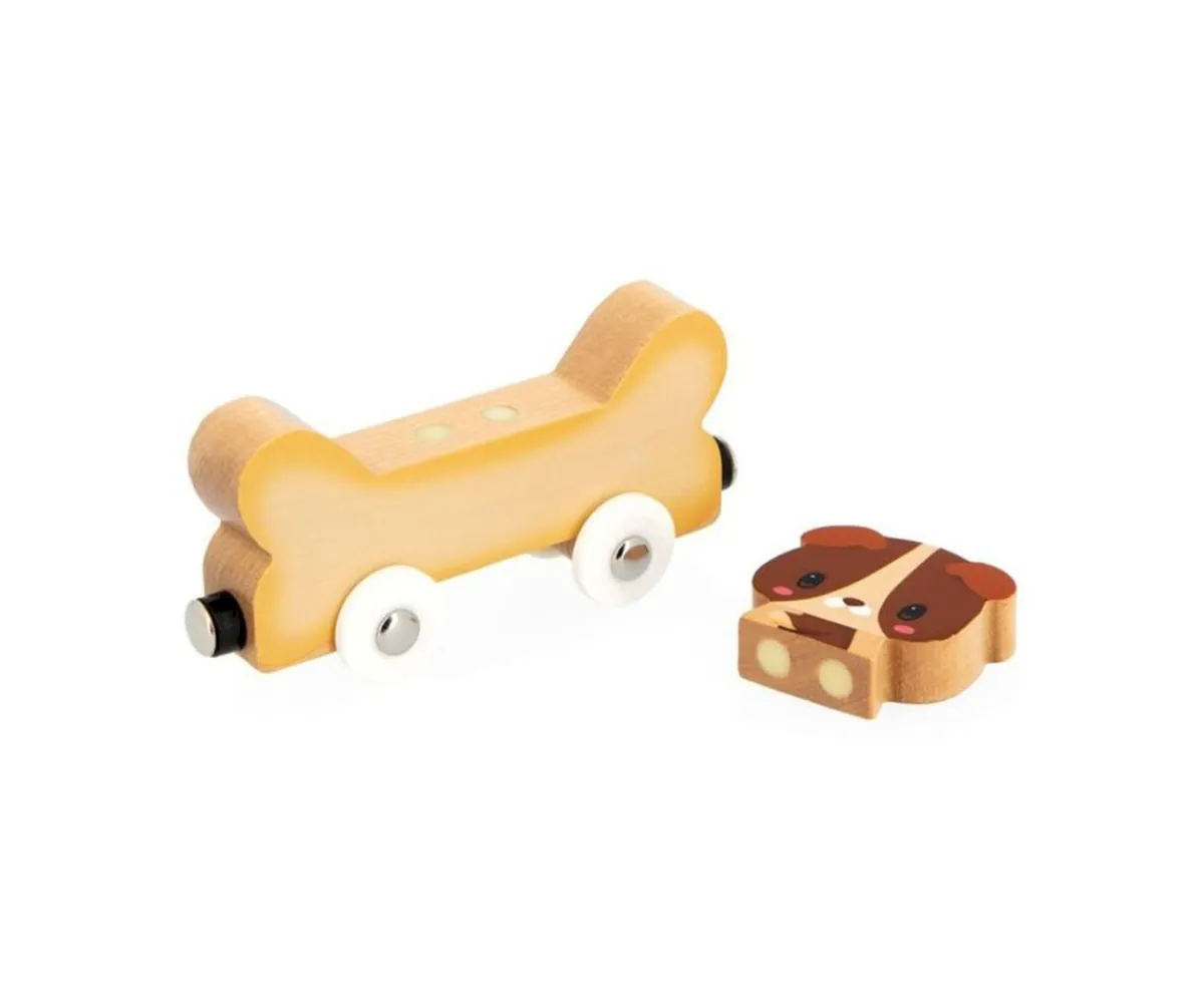 Con los coches y animales de madera de este juego magnético, los bebés disfrutarán de emocionantes carreras. Este juguete estimula la motricidad, la imaginación y la lógica de los niños. Incluye 3 coches (zanahoria, hueso y queso) y 3 personajes de madera (perro, conejo y ratoncito).